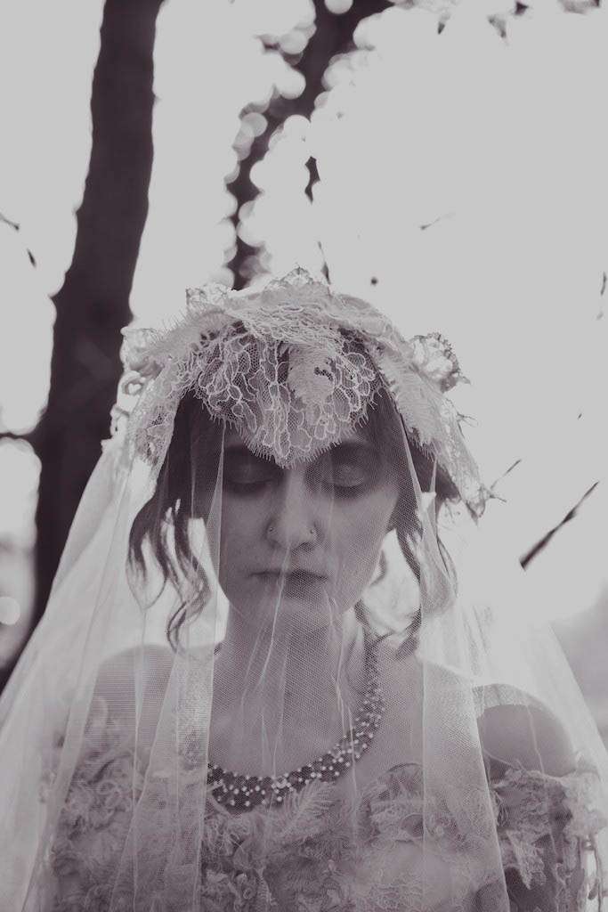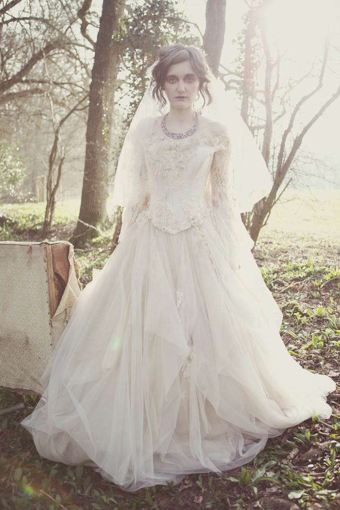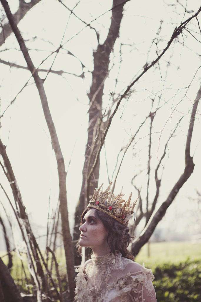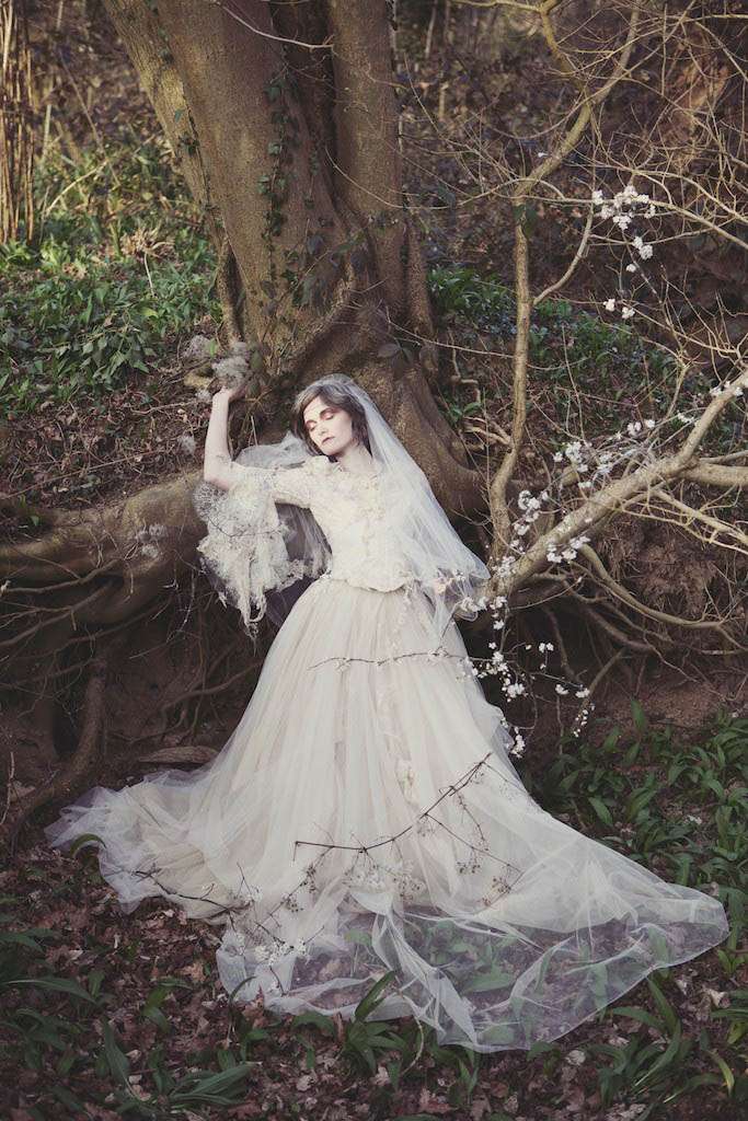 I was tasked with the fashion styling and as soon as we’d decided on the brief, I knew there was only one woman for the job of creating the perfect wedding dress – Jo (& her assistant Sally) from The Couture Company. These girls are masters of corsets and are well known for their gorgeous and huge tulle skirts. I just knew with Jo’s flair for design and Sally’s genius and intricate eye for detail that we’d have the perfect dress. Jo didn’t flinch when I told her we wanted the dress to look ‘kinda decayed and covered in, you know, fungi and stuff…’ and she created this beauty for us from scratch. She added antique lace to the dress and my veil (yes from my own wedding) to complete the look. We even borrowed a crown from Elisabeth Armstrong. Isn’t it amazing?!