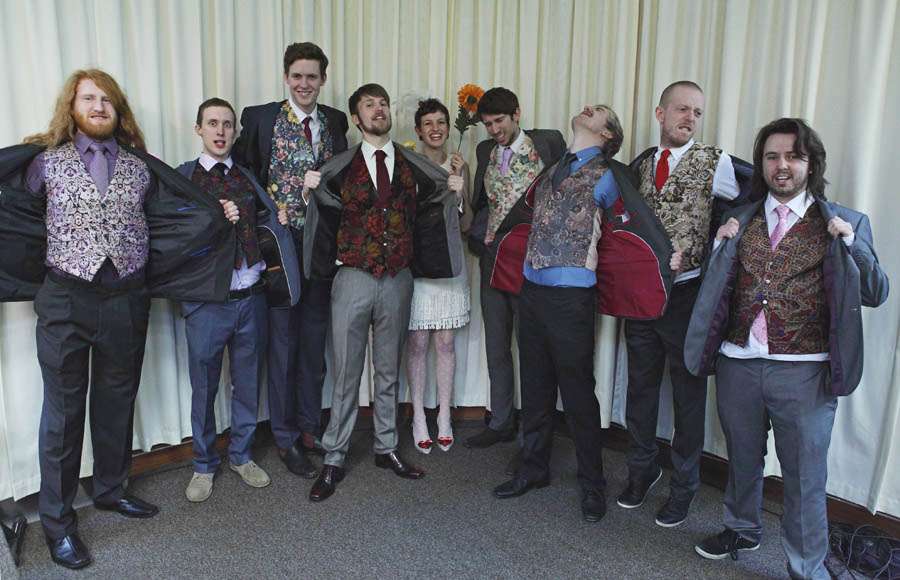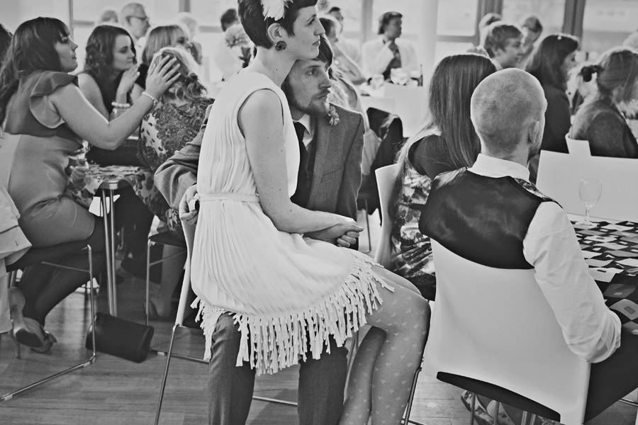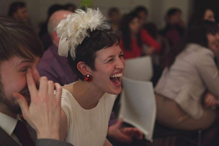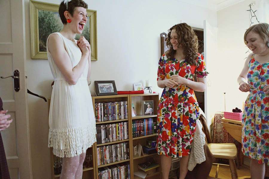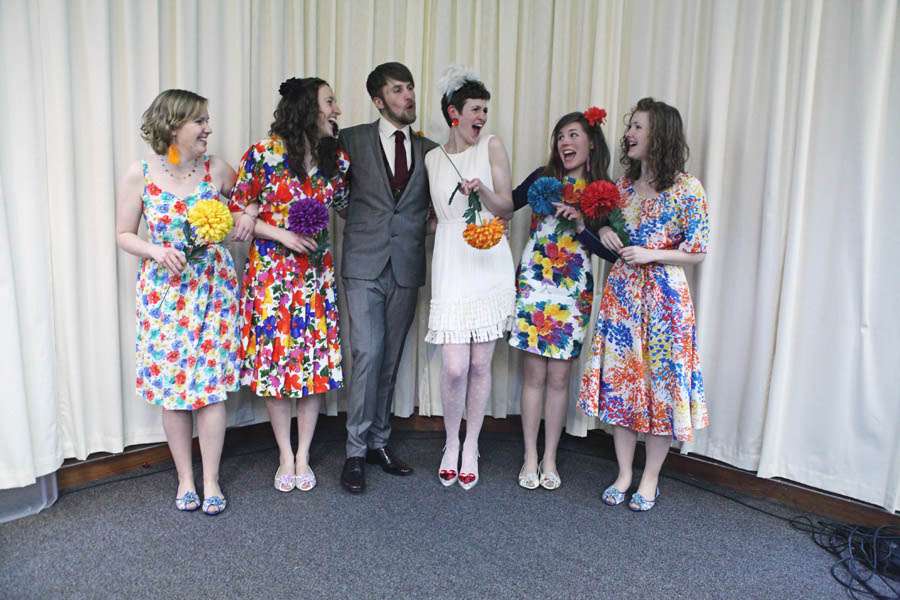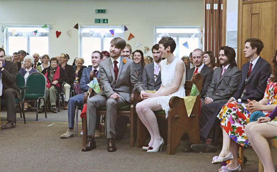 The bride wore a short dress which she found at Whistles. “Being a fan of recycling, hand-me-downs, charity shops and vintage shops (when I’m feeling flush) I had been looking for something second hand. I knew I wasn’t a meringue bride, and I had no desire what-so-ever for a strapless floor-length number with diamante tiara and shoes to match. One friend said to me ‘You win either way, if you turn up in something outrageous, everyone will be shocked, if you turn up in something classic, everyone will be shocked.’ I contemplated dressing up as a Power Ranger for the occasion (just think of everyone’s faces!) The dress I ended up in, however, even caught me by surprise.”