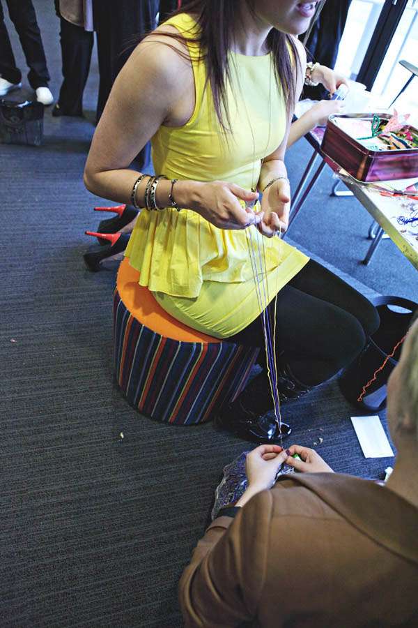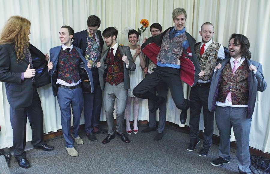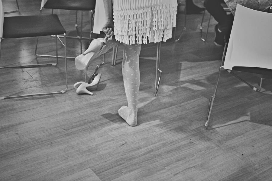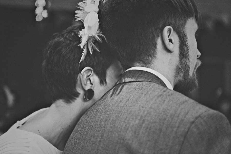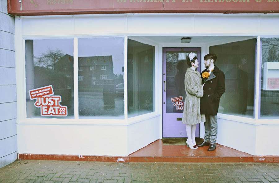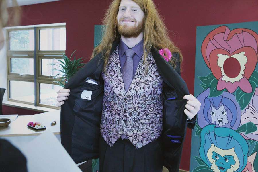 The bride wore a short dress which she found at Whistles. “Being a fan of recycling, hand-me-downs, charity shops and vintage shops (when I’m feeling flush) I had been looking for something second hand. I knew I wasn’t a meringue bride, and I had no desire what-so-ever for a strapless floor-length number with diamante tiara and shoes to match. One friend said to me ‘You win either way, if you turn up in something outrageous, everyone will be shocked, if you turn up in something classic, everyone will be shocked.’ I contemplated dressing up as a Power Ranger for the occasion (just think of everyone’s faces!) The dress I ended up in, however, even caught me by surprise.”