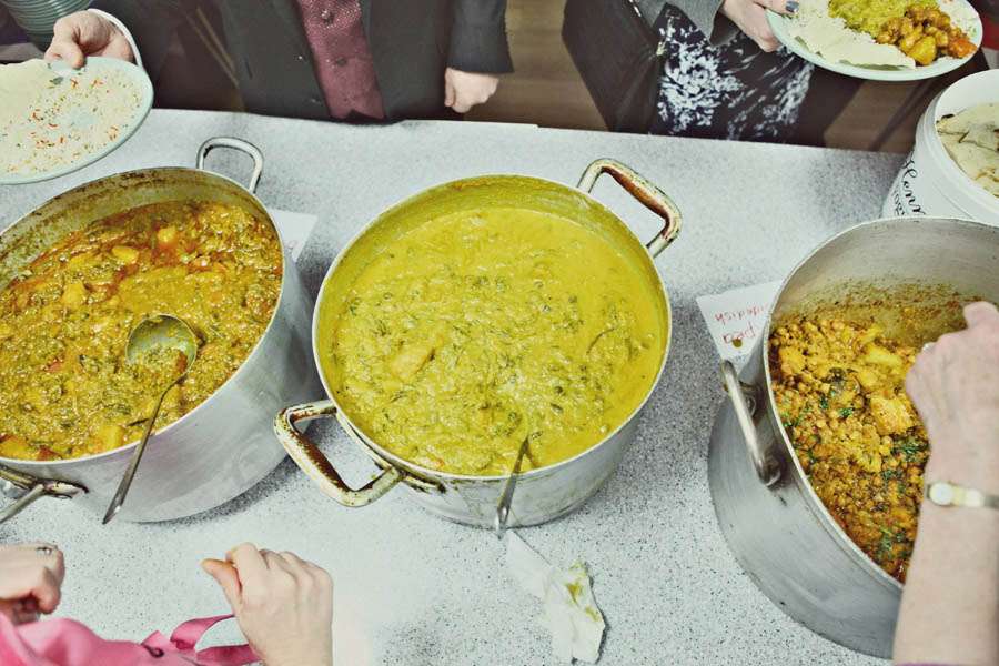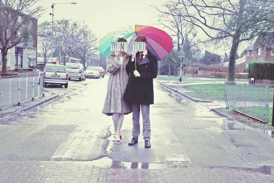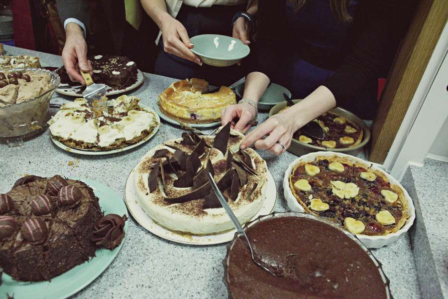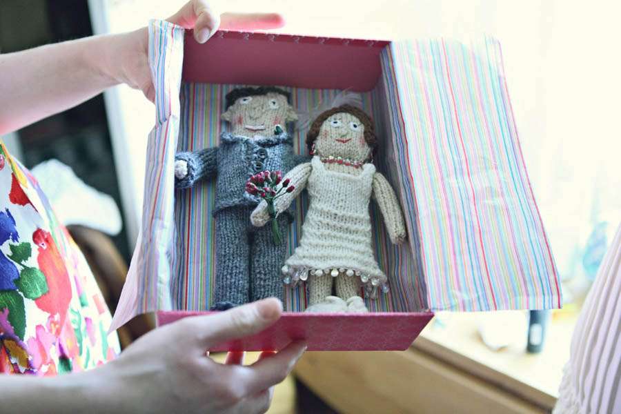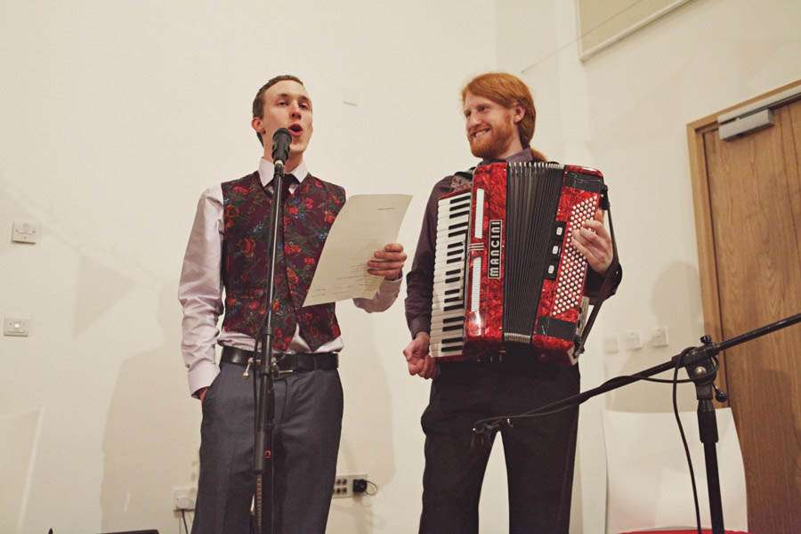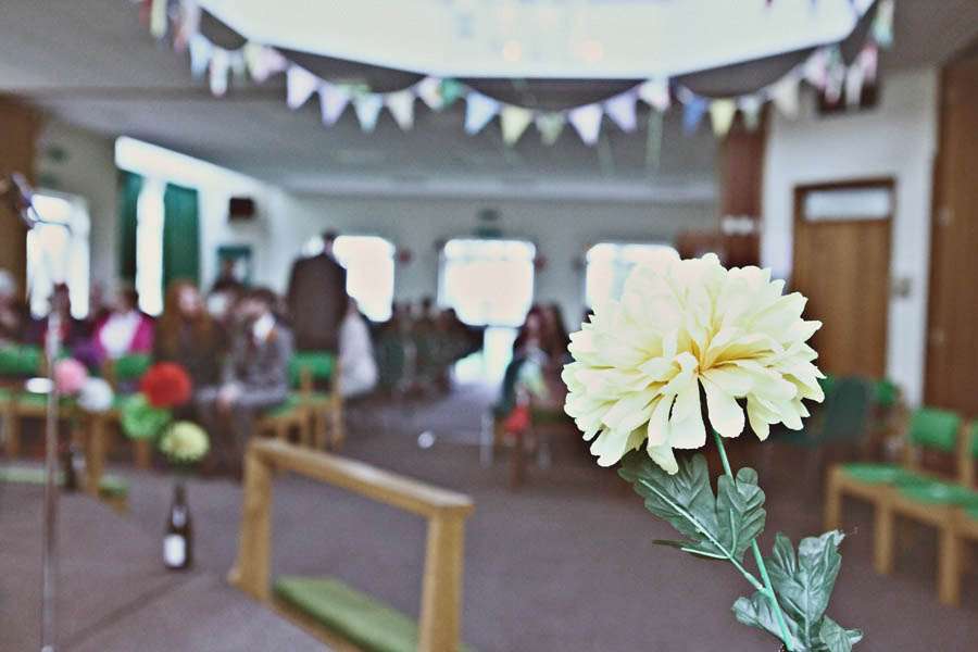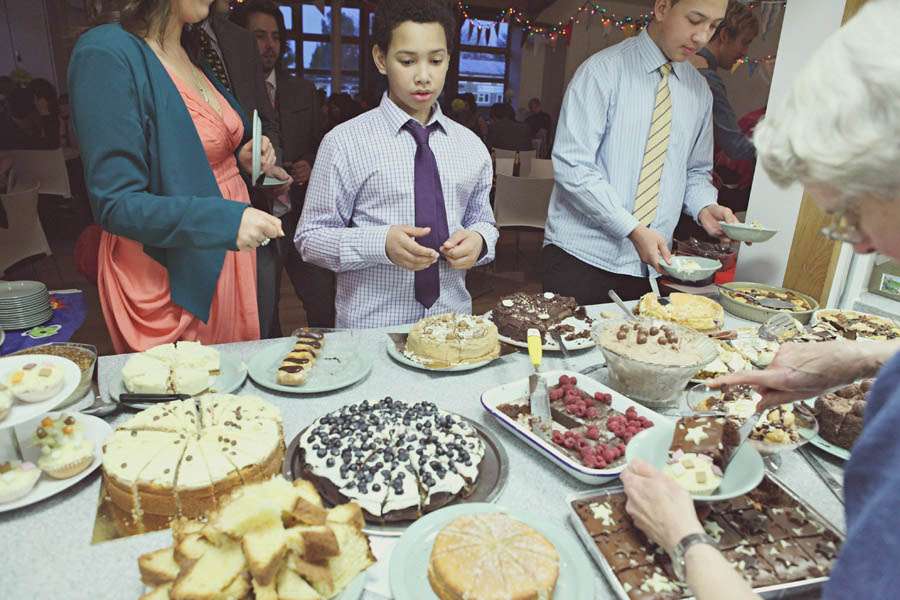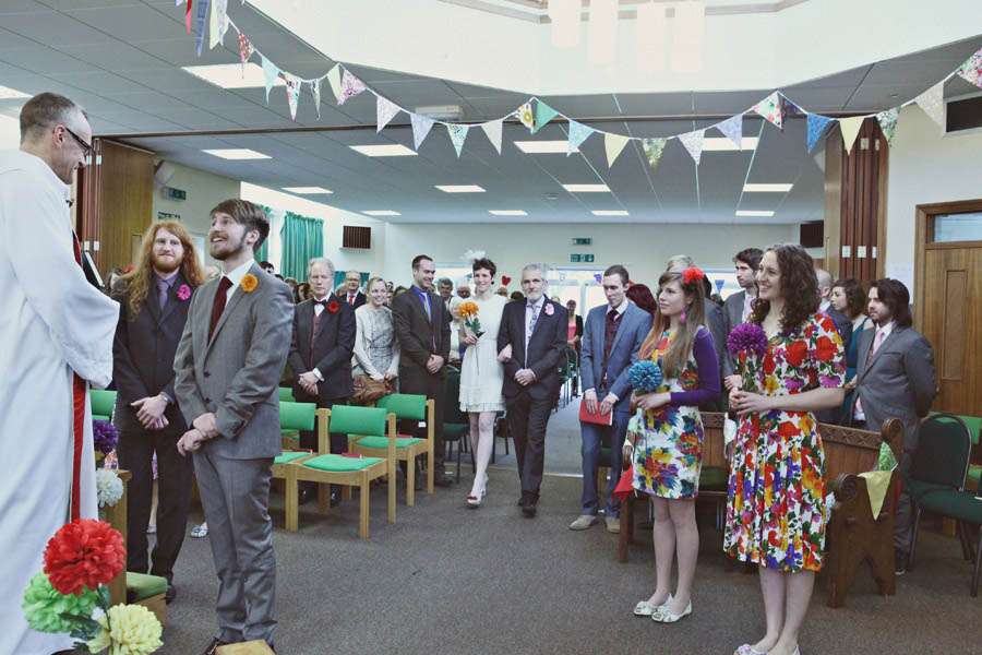 Pretty much everything else was DIY as well including the cake which was made by the bride’s aunt, the fake pom pom flowers which were put together by the bride’s parents and grandparents, and all the entertainment and music that was performed by various talented friends. The catering was also put on by some of the women who worked at the church. “My Mum had found a team of helpers from the church, who selflessly doled out and washed up after us all. We really couldn’t have done it without them, and yet they all thanked us for inviting them. People’s generosity was just astounding. After the service we ate ginger biscuits lovingly made by both of our mothers and drank mulled wine. We were really keen that everyone could come to every part of the day. We didn’t want to send some people away for the reception and then drag them back for the evening, so we decided to have curry from the place across the road. We could literally see their shop from the window in the hall where we ate. They were just so wonderful and insisted that we couldn’t possibly have onion bhajis, because they are just onion! They would make us their speciality, which was very tasty indeed. Richard and I are both vegetarians, so there was no meat, but no one seemed too phased by that! We had asked guests to bring a pudding along, and so we were not short of choice!! In fact we didn’t even get to see half of them! Thank goodness for photos! For drink, my Nanny and Poppa had bought every last Cobra from Tesco when they were on offer, and my Dad got a deal with a mixed load of wine. So we ate, drank, and were very merry indeed!”