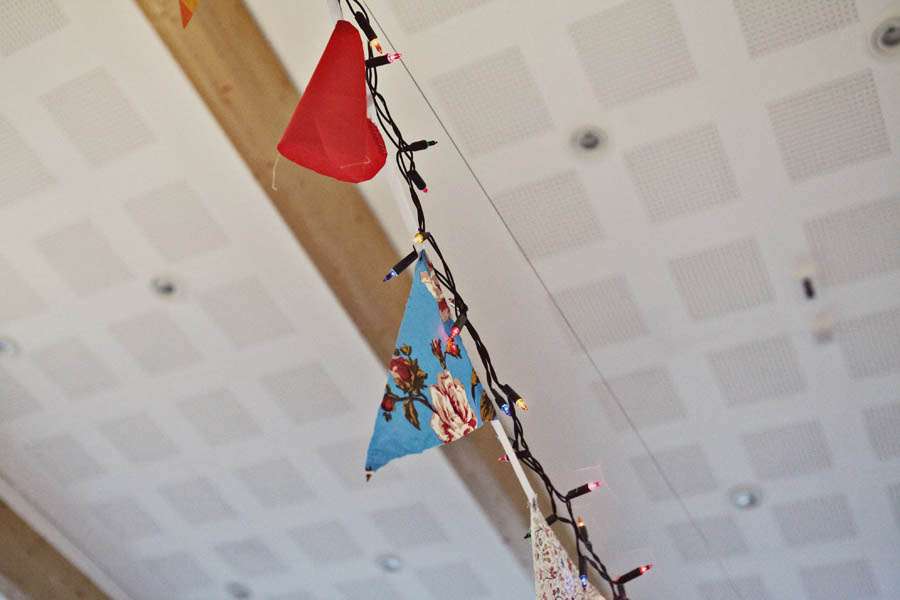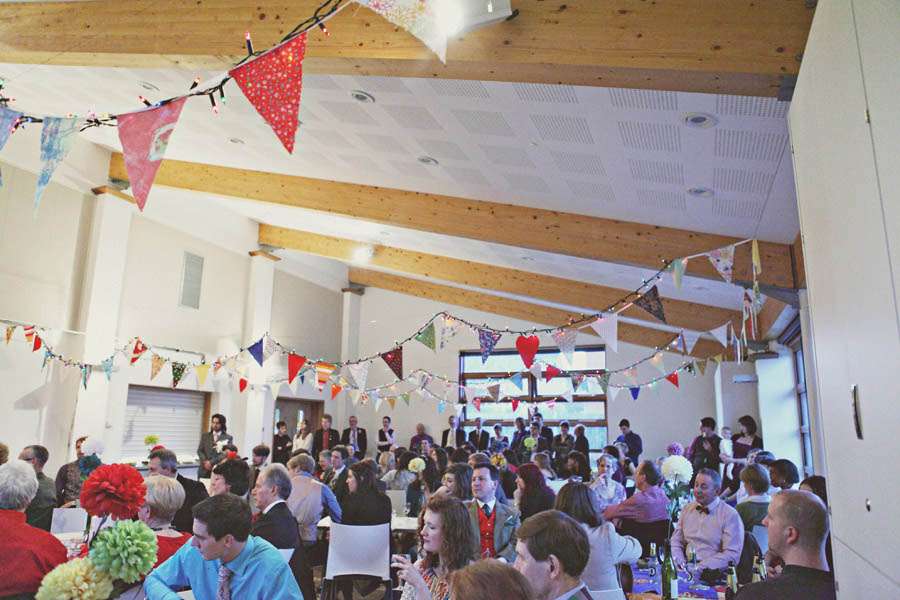 The reception hall was decorated with the help of friends and family. They didn’t have a concrete ‘theme’ per-say, they just made the space warm, welcoming and fun! “My Nanny had valiantly made 150 meters of bunting with bits of fabric donated by people from the church, friends and other family members,” continued Zoe. “It was so lovely because people at the wedding said things to us like, ‘that piece there was the material I used to make a dress for my honeymoon’ and ‘that fabric was my old kitchen curtains’, so it was like all of these stories were tied together, and all the people who came together for our wedding, with all of their histories, were connected in some way. It was also very colourful indeed!! We used the left over odds and ends as table cloths.”