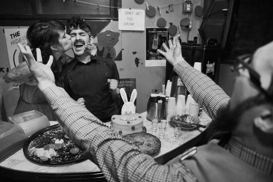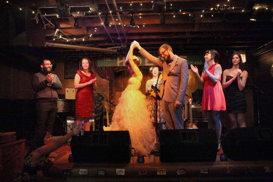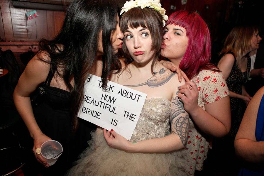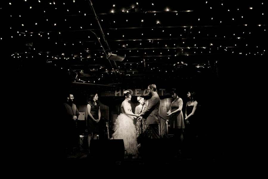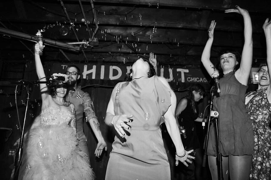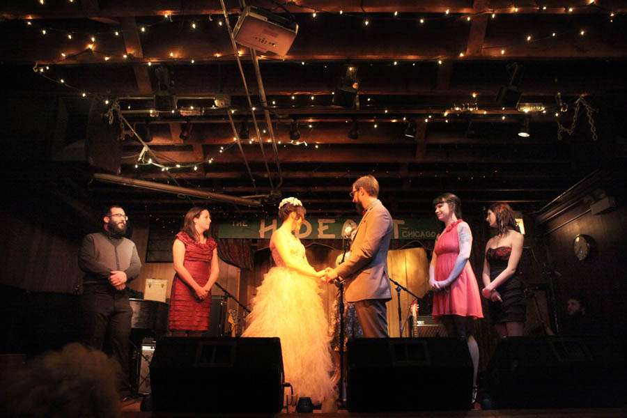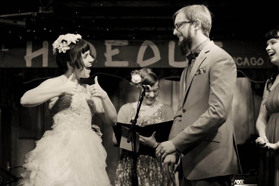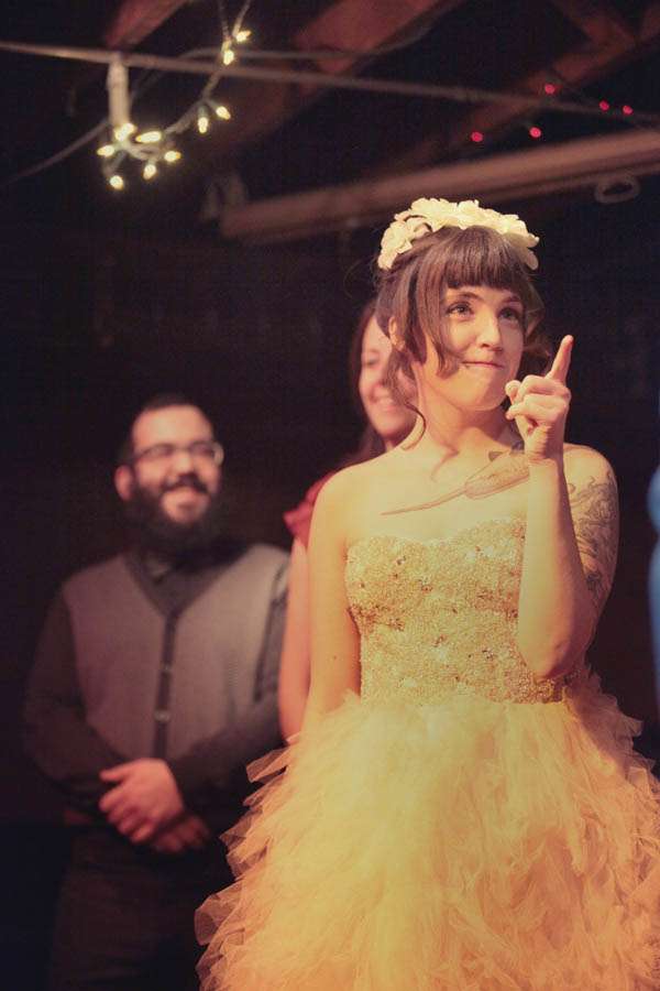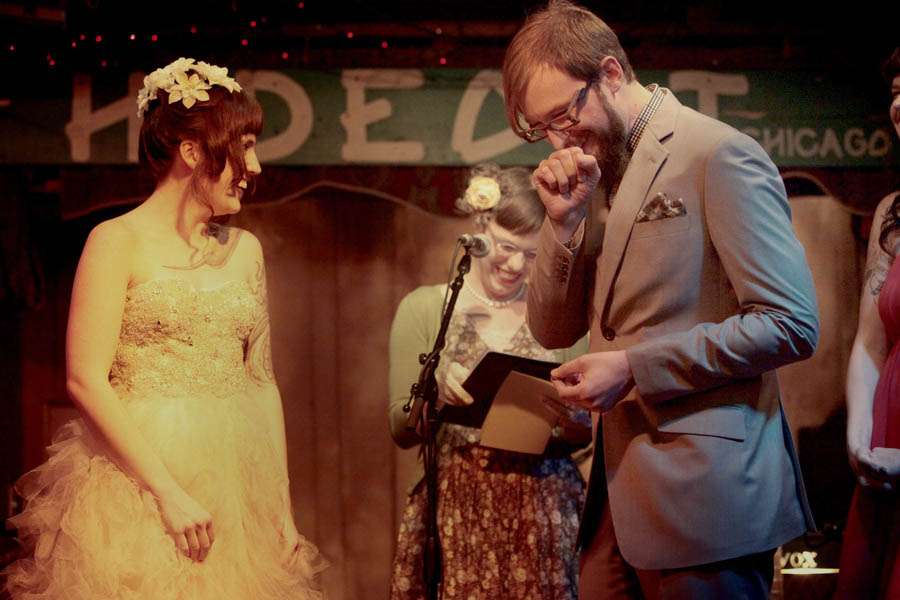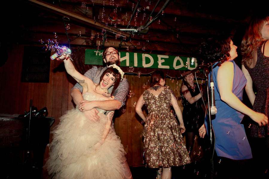 The wedding was held at The Hideout, Chicago and the aim of the game was for the couple to throw a party that reflected them and their love. It wasn’t about the froof or the perfectly matching napkins, it was about celebrating! “I don’t really know what our inspiration was, ” Morgan told me. “We just did what we always do. We came up with the stupidest thing we could think of and make it exist…just like our marriage haha!”
