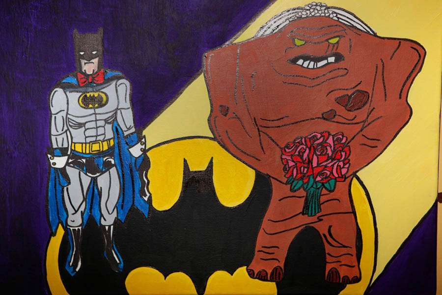 “Our cake toppers were Batman and Clayface Mini-Mates. I glued some flowers to Clayface and gave him a bouquet, and Zoe (who also did my hair and make up) painted a tux on Batman. My friend Jamie Knight painted a portrait of the two that hung behind the desserts. Why Batman? Why Clayface? Batman was a given, as Dustin Drase is the worlds greatest detective, But I had trouble choosing the character that was most ‘me’. Unable to make a decision I just went with the big, fat, mud-monster as ‘big, fat, mud-monster’ is my spirit animal.”