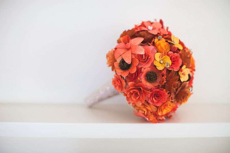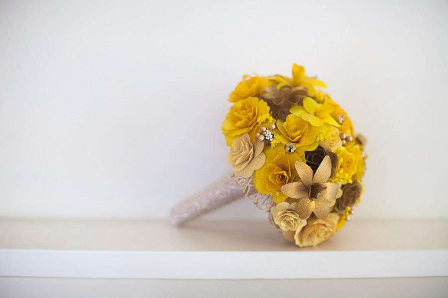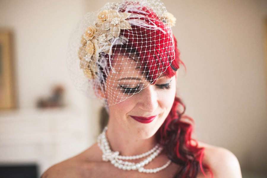 Being a headpiece designer of course Jen made her own headpiece as well as the ones her bridesmaids wore. “I made so many fascinators for the guests at our wedding and we had taken on so much in the way of DIY decoration, that I hadn’t even started to think about my hairpiece for the day three days before. I just kept getting on with other things that needed doing. Finally I got to it, and am really pleased with how it turned out. I made a mix of the wooden flowers that we used in all our decorations, and a version of my bleached peacock feather flowers, and finished them off with crystals and pearls. I wore a tangled pearl necklace and bracelet made by my good friend Helen (Fruitloop Designs) so this tied everything together”