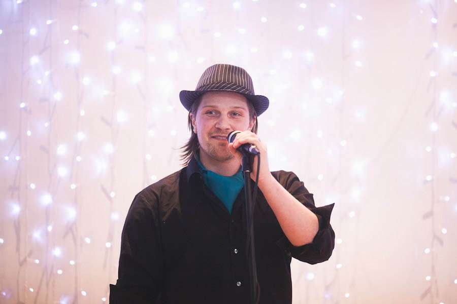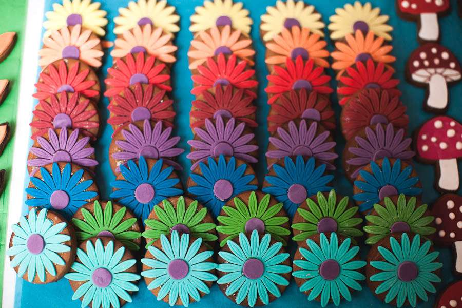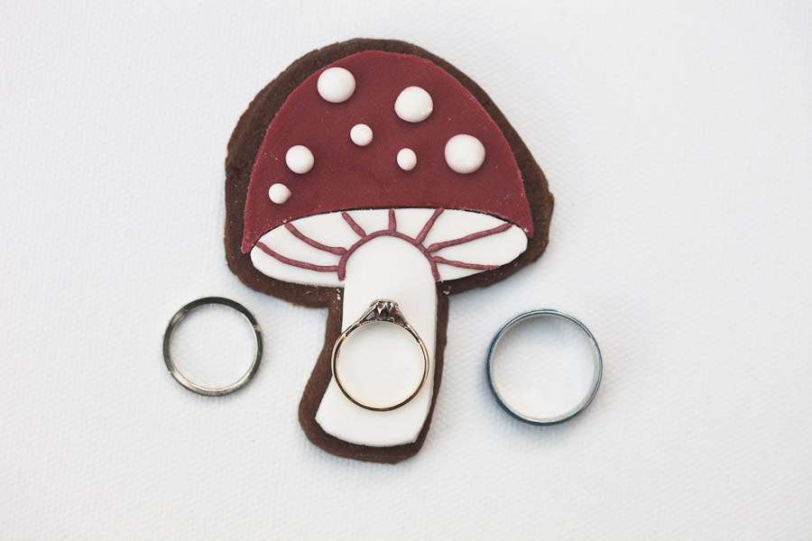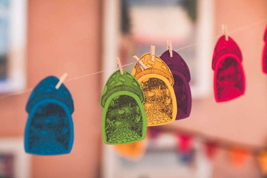 “We wanted our wedding to be bright and colourful, so I suppose the theme multi-coloured fun-fest,” Jen continued. “So many people advised against it, saying we should stick to just 3 or 4 colours, but we knew it was going to work. Bright colours are just us. The invitations (drawn by me) were a magical wonderland inside a toadstool (the swing in the middle is in the grounds of The Matara Centre), so halfway through planning we decided to have as many toadstools at the wedding as we could. We printed off mini versions of the toadstool drawing on coloured card for our guests to write us messages on and peg them to our ‘guest book’ washing line and framed a large copy of it in the venue with our names and the date on. We also had a magic toadstool drawing tea-towel printed for favours for all our guests too. We even made 20 paper mache red and white toadstools which we put around the venue. The ushers had the job of secretly moving them around throughout the day, so it was like they were just popping up out of nowhere. Guests got to take these home at the end of the day too, which was lovely.”