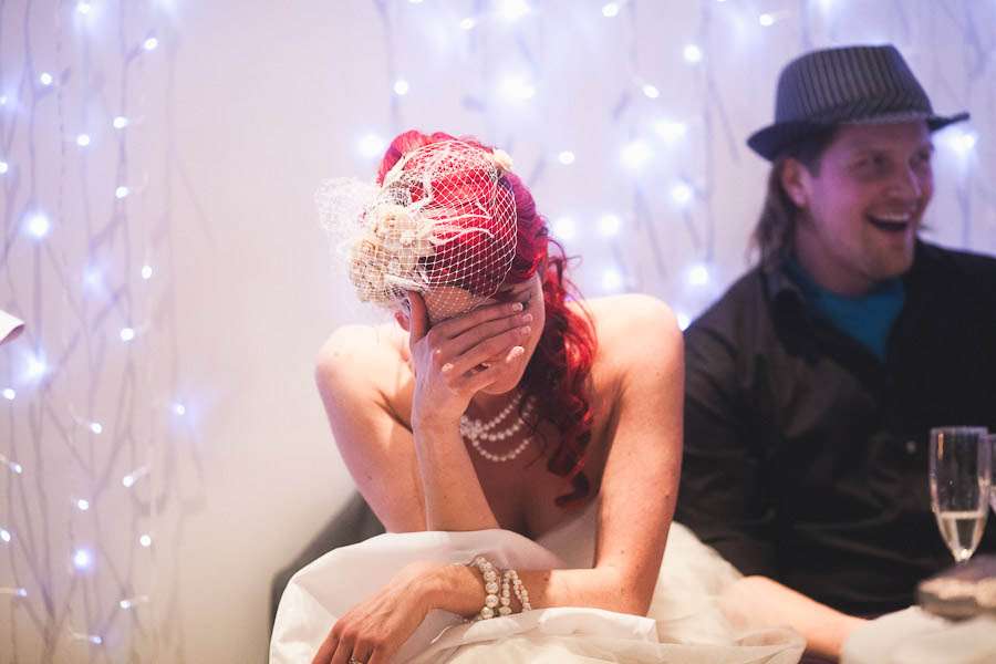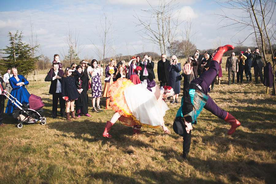 Jen wore a 50s style dress which she had made by Honeypie Boutique. She really wanted a firey petticoats (oranges, reds etc) and Ann of Swank Underpinnings was up for the challenge! “When I first started looking for a dress I was do disillusioned by the whole process. I knew I wanted to have a short dress, because we would be dancing (a lot) and going to plant a tree, and I am a bit clumsy – I would have definitely got tangled up in it at some point. The first bridal shop assistant quite plainly told me that it was a ridiculous idea, and I wouldn’t feel like a bride in a dress that didn’t come to the floor – I was stunned (she has obviously never read Rock n Roll Bride!) Then I got in touch with a wonderful dressmaker who, it seemed, would answer all my prayers. Then she started ignoring my emails/tweets/phone messages. In the end I ordered a dress from Honeypie Boutique (lovely people that will do anything for you) and ordered a custom petticoat from Ann Swank. I customised the dress by taking the back out, and adding tulle to the bust, and I love it.”