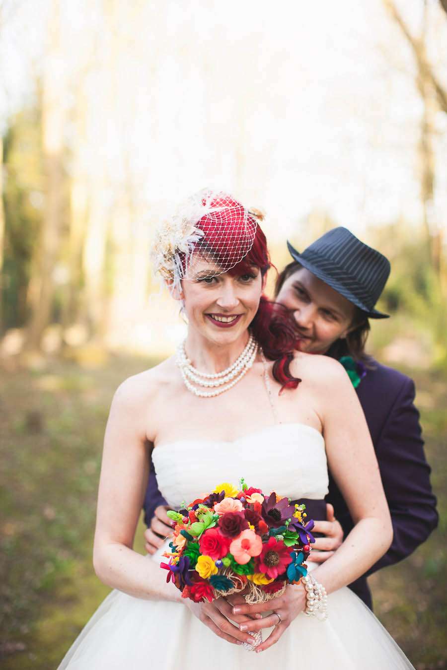 The outdoor ceremony and rainbow-covered reception were both held at The Matara Centre in the Cotswolds. The venue decor and rainbow touches were a real labour of love as the bride explains, “Working in the wedding industry (I make bridal headpieces and my company is called Head Full of Feathers), I knew I wanted to make things very personal to us. There are so many weddings that all look so very, very similar. We concentrated on having only the aspects of a wedding we liked the idea of, and got rid of the rest. We just wanted a huge colourful party with all our friends, and that’s what we got. We wanted the day to be as jam packed with things to do as possible, and the venue has such beautiful grounds that we wanted everyone to see them. So we got everyone to bring wellies and we went out to plant a cherry tree (Blossom flowers are my most favourite flower) It was a wonderful sight to see everyone playing about in the sunshine (in Feb!) all dressed in their best, and their wellies.”