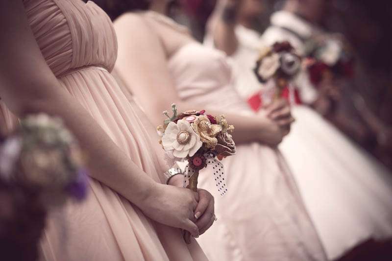 “We tried to DIY and upcycle as much as we could for our wedding. For example the napkin holders were made out of toilet roll cores, cut-up and then covered with vintage curtain material that my late grandmother used. We collected hundreds of tin cans & placed tea lights inside them to light up the walk way. My Mom also helped decorate an arch for us to use during our exchange of vows. In fact, my Mom did too many things to mention!! Last but not least, are the bouquets. All the bouquets were made by my very talented husband, Julian!”