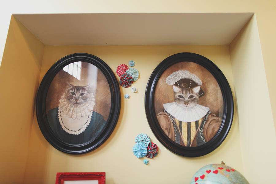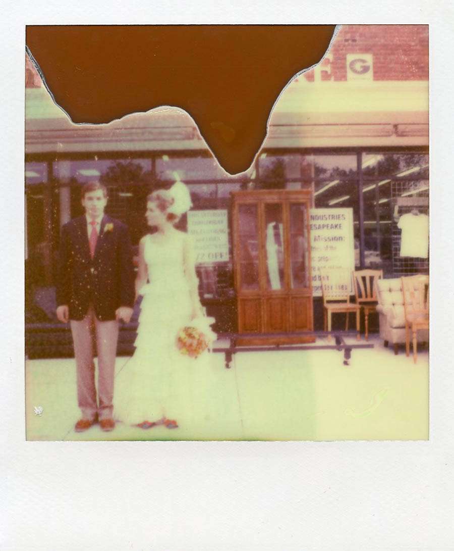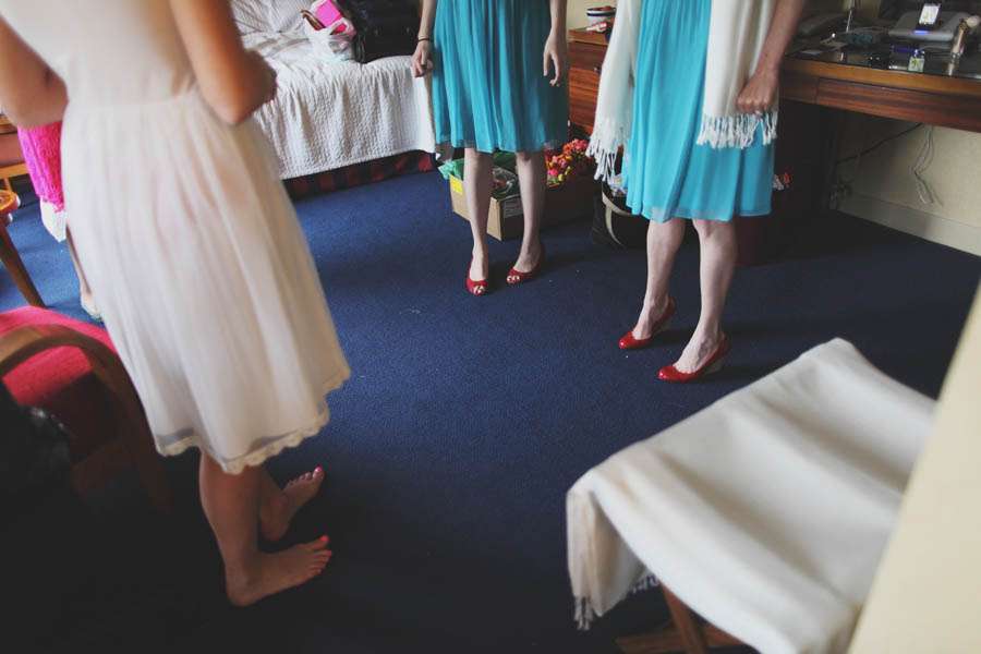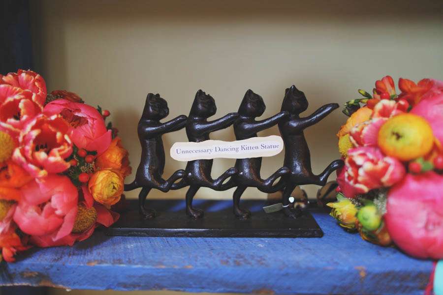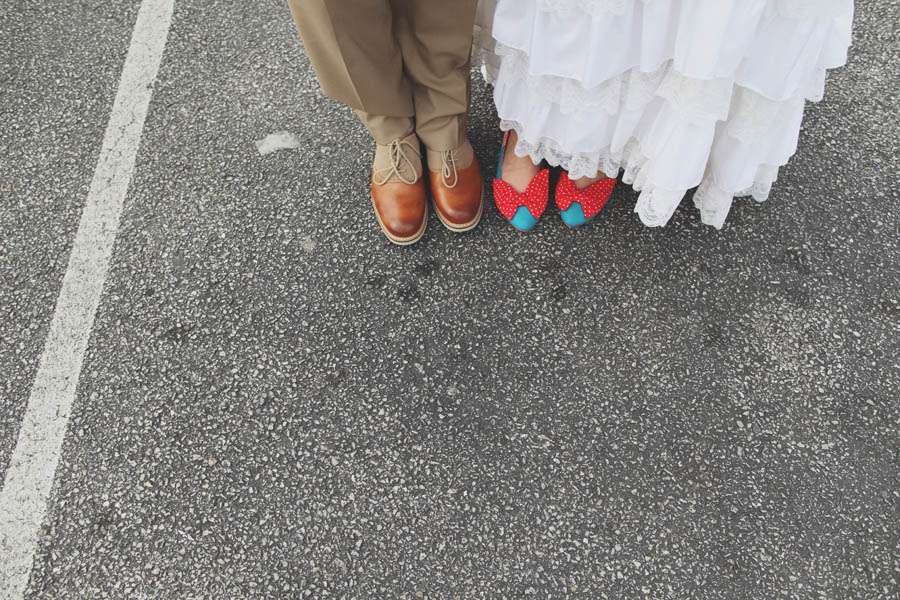 The bride wore a vintage wedding dress to which she added a homemade sash, a gorgeous Twigs & Honey veil and quirky Irregular Choice shoes. “The base of my dress was from my MOH’s childhood dress up clothes. There wasn’t a piece of this wedding that wasn’t touched by her unparalleled imagination. Her and her mom helped to make the sash and bow.”