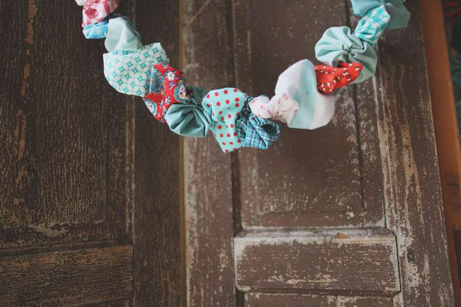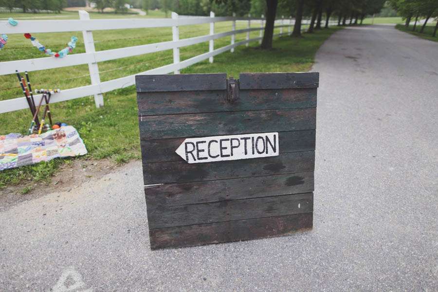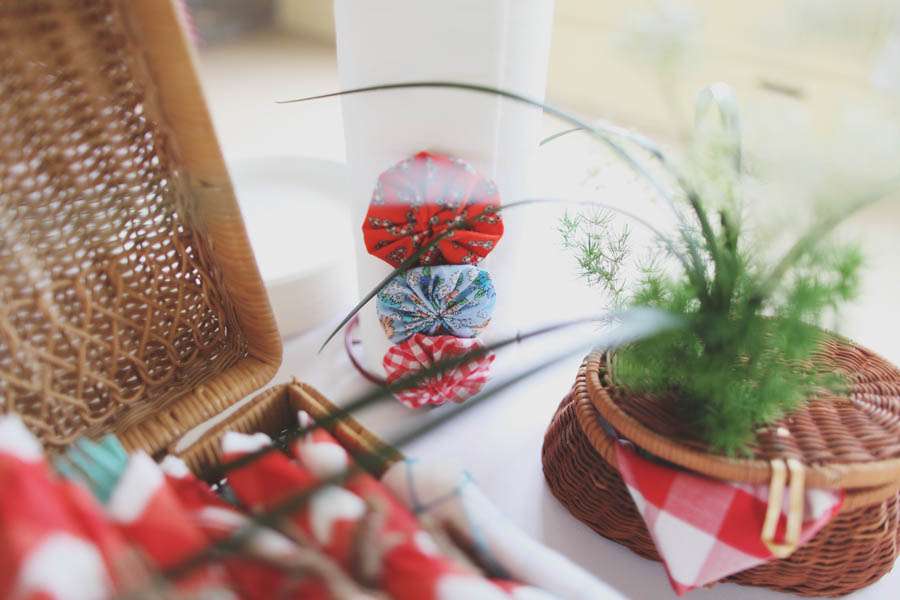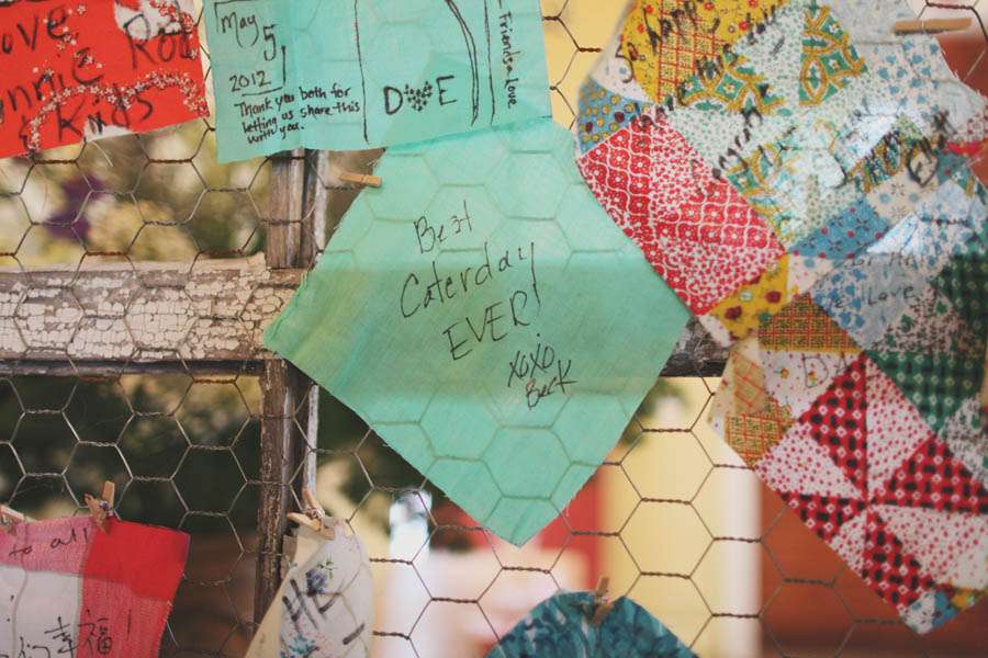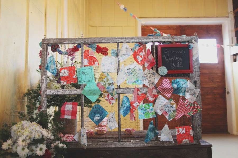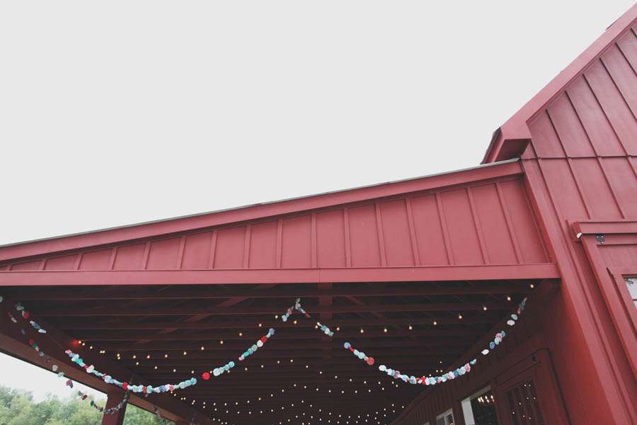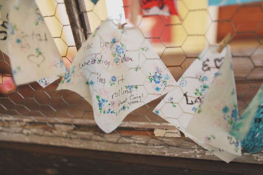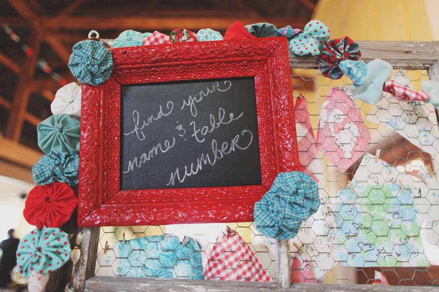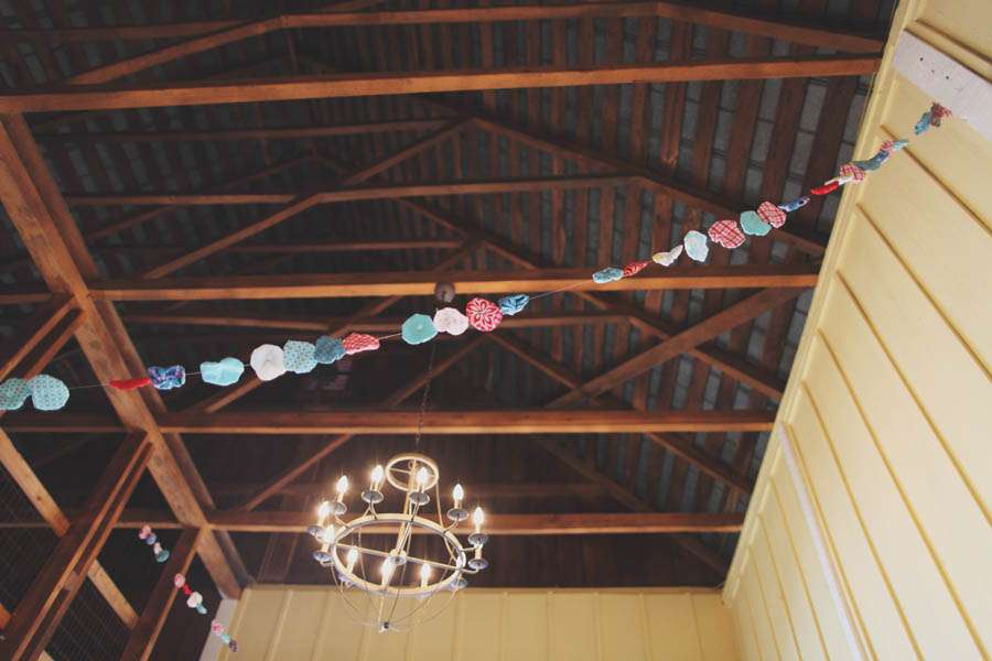 “We also made fabric yo-yo’s! Those darn little fabric circles with the gathered middles. With the help of family and friends, we made over 1200. We even had a yo-yo making party. Sort of like a quilting bee. In the end, we had enough for garland in the barn, welcome bag decorations, boutonnieres, wall hangings, they were everywhere…”
