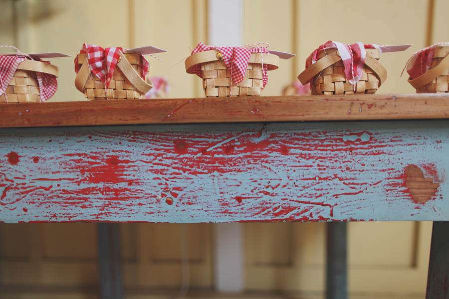 To give the wedding a personal touch, the couple and their family DIY’ed as much as they could. “My Mom and Dad helped make the miniature picnic basket favors”, the bride continued. “Inside each was full of kufeta, or Greek jordan almonds. For a while, the dining room table was piled high with these little guys – it looked like an elf workshop. The wedding programs came equipped with a vintage hanky, each one different. My Mother-in-law found hundreds of them at a yard sale in Illinois for next to nothing. I had wanted to construct a quilt for our “guestbook” wedding quilt but I ran out of time. However it turned out to be a blessing in disguise as I think the vintage squares, which people wrote personal notes on, worked out better!”