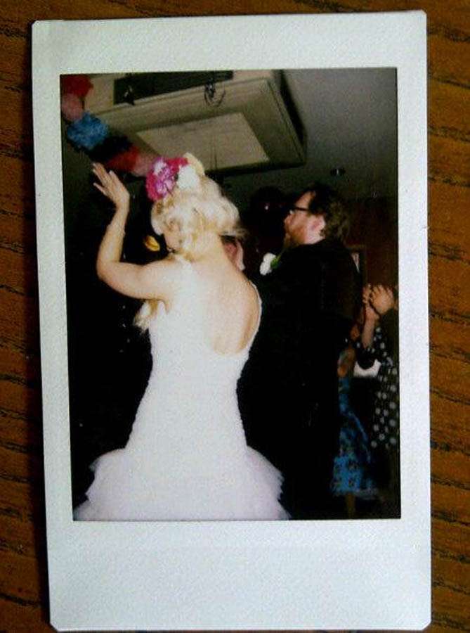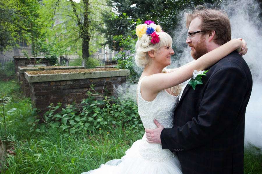 “We love old Spaghetti Western Movies, the Mexican Day of the Dead festival and a huge passion for 60s and 70s Country Music”, Jess concluded when I asked about their wedding theme. “All these styles influenced our wedding, from decorating the venue like a Mexican fiesta to using a smoke machine in our couple shots! My wedding dress was a vintage flamenco style from Pronovias and Martin wore a classic 3-piece suit, a bolo tie and a pocket watch & chain which I have him the night before the wedding.”