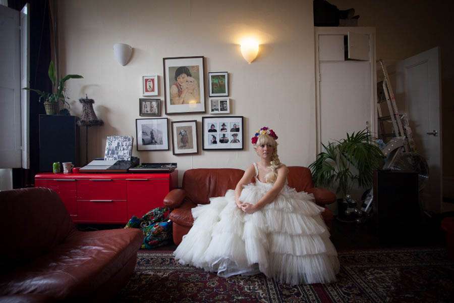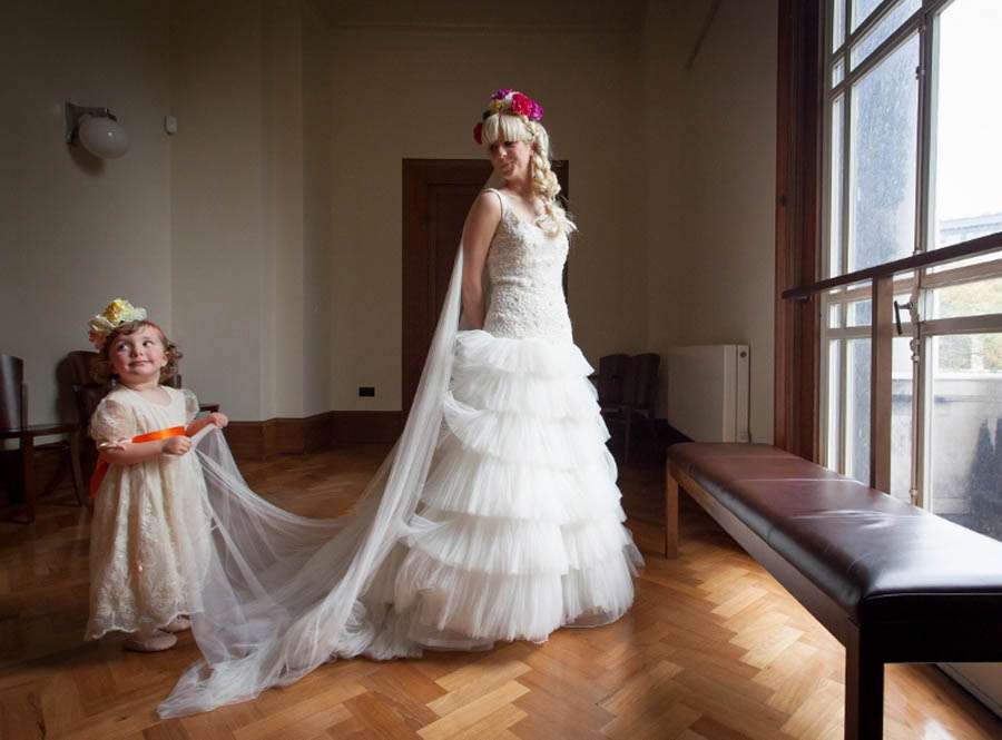 The bride’s gorgeous style was inflenced by Frida Kahlo and Spaghetti Western movies! “I didn’t buy a jacket as we assumed it would be warm May day – so last minute as it chucked it down with rain so I grabbed my battered beloved black leather biker jacket I’ve ad since she was 14 and chucked it on over my wedding dress. I don’t think I could have bought a more perfect jacket. Instead of a traditional ‘up-do’ I wanted to replicate Frida Kahlo’s famous floral head garlands. The bridesmaids and I spent hours trimming, building and practicing wearing my headdress.”
