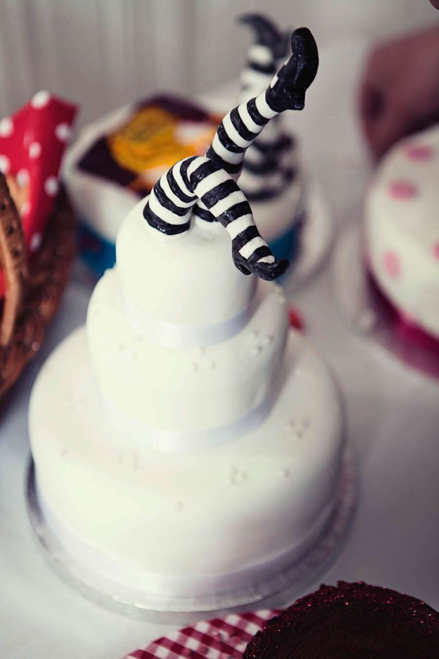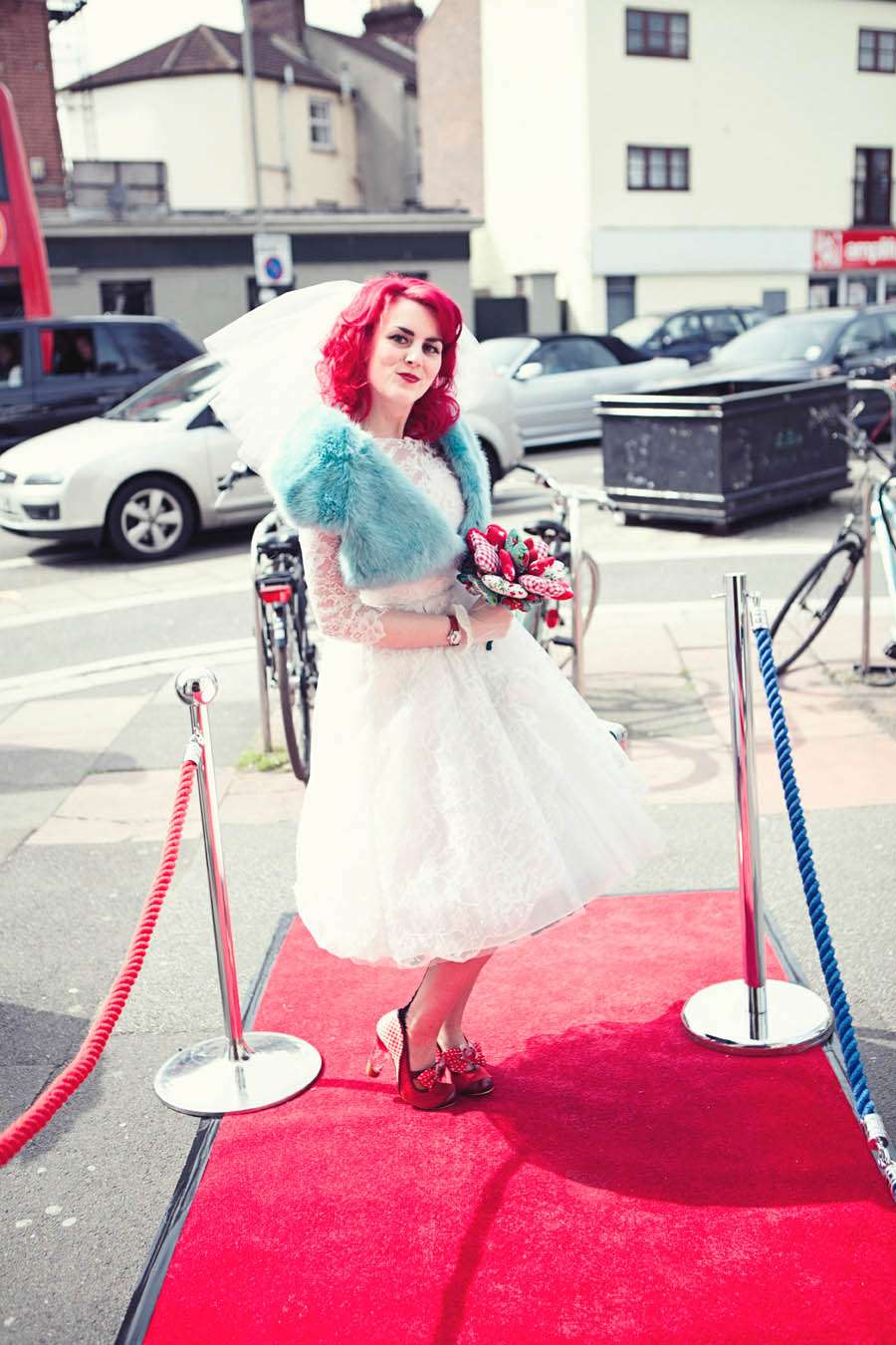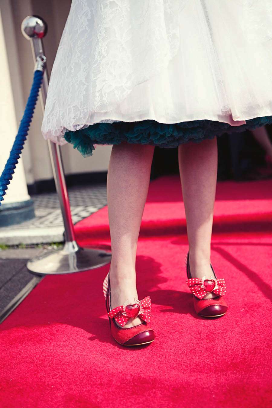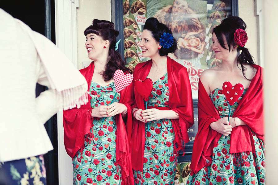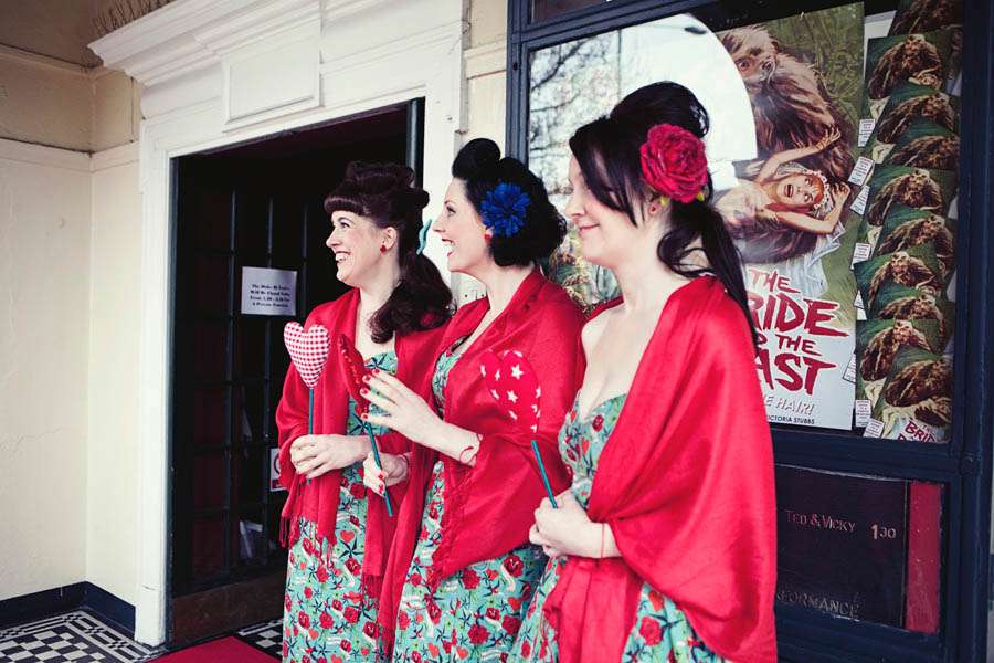 “Although we wouldn’t like to think we had a ‘themed wedding’ it was blatantly a movie themed wedding, with a vintage edge. I love all the vintage weddings I see online (with lace, dainty things and hay bales etc), but I knew that Ted and I were definitely more… cartoon/comic book vintage than dainty vintage! So we wanted more colour and humour. When I stood outside the cinema with the bridesmaids on the red carpet, I felt so glamorous and happy, I thought we looked like we had stepped out of an Elvis film! Ted asked if I was disappointed he didn’t dress up as Elvis but I wasn’t! I loved his tweed suit – it really was ‘him’ and people said he looked like a matinee idol!”