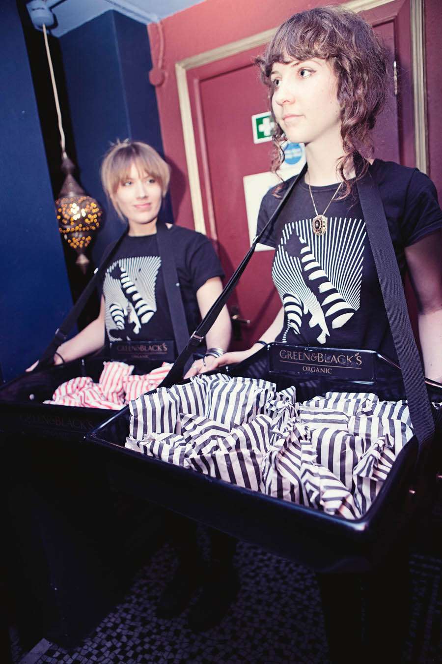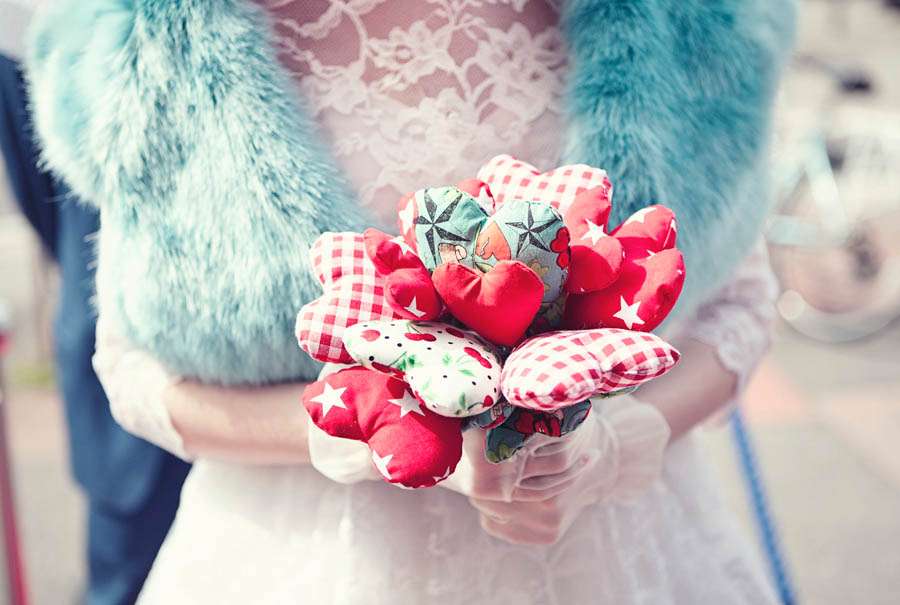 “I love a wedding, but we had been to so many where the main difference was the colour of the bow on those annoying chair covers!” Vicky continued. “Ted and I discussed the fact that we really didn’t like the traditional wedding suits from Moss Bros etc. and were just not big on ‘standard’ wedding stuff. We had also been to a lot of weddings where the Cheeky Girls, the Macarena and various other dire tunes were gladly played out, so we were looking forward to the chance to have some good tunes for the dancefloor (don’t get me wrong, Footloose is one of my favourite dancing songs. There is a fine line between cheese and mouldy cheese!) So our starting point was already all about trying to avoid those dislikes, but then I discovered wedding blogs! Oh the joy! So most of the inspiration came from blogs like Rock n Roll Bride. Just being able to see other people doing amazing weddings that were about personal touches and fun, silly stuff inspired us. I saw someone serving cola with striping straws and decided I wanted bottled drinks with stripey straws… but went for Babycham… saw the heart bouquet on Rock n Roll Bride I think and stole it, but with a twist.. picking different fabrics and coming up with the idea of large hearts on sticks for the bridesmaids.”