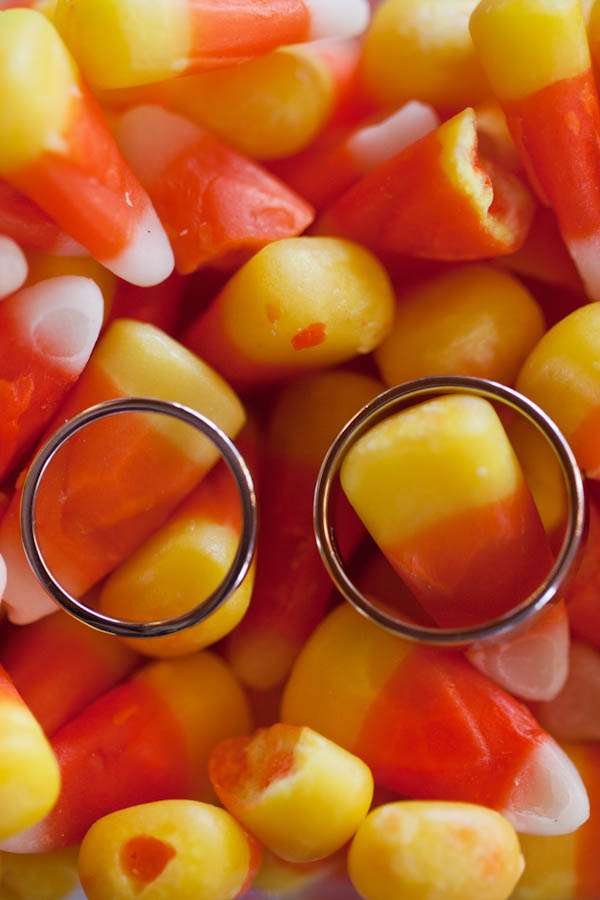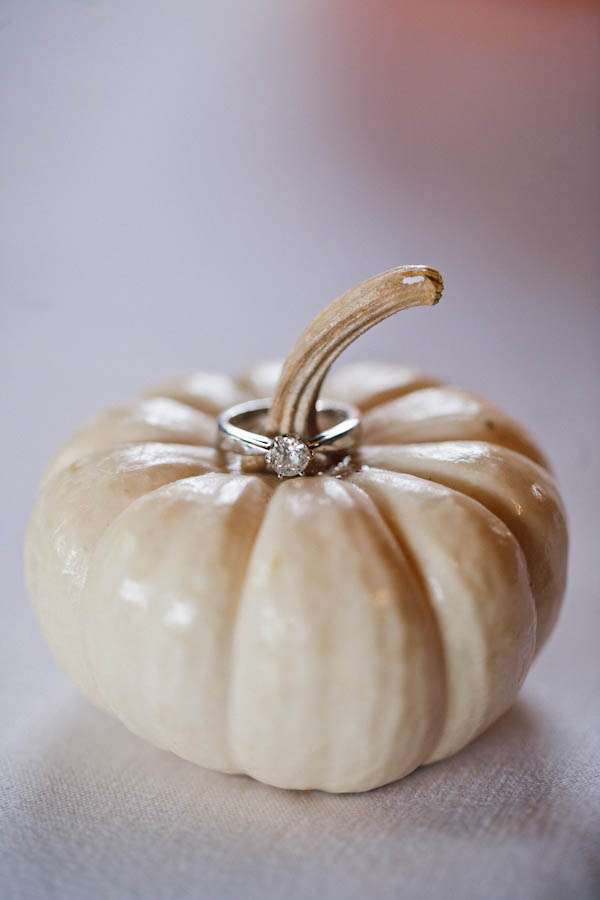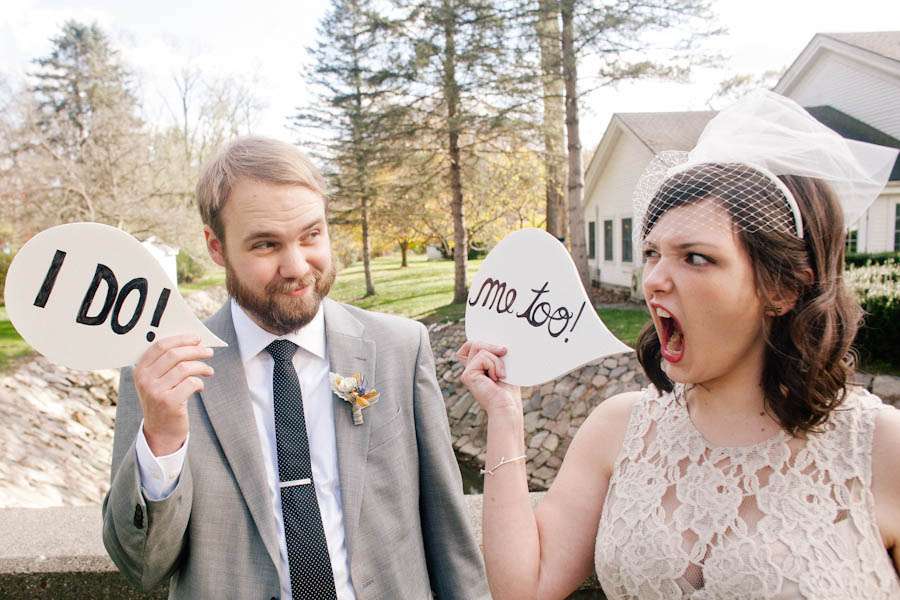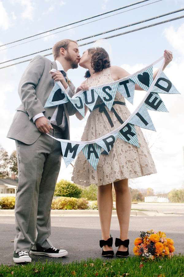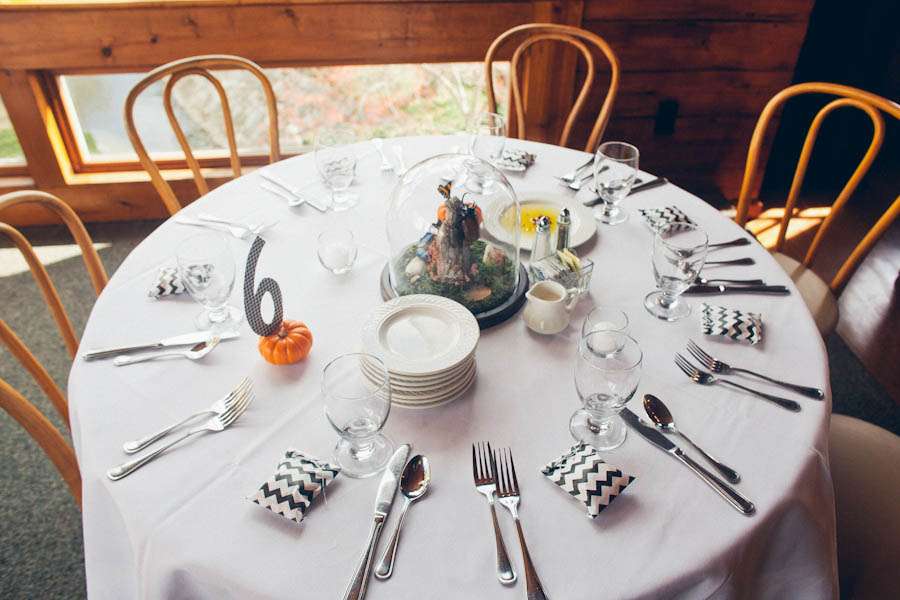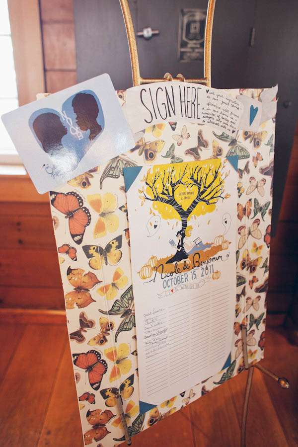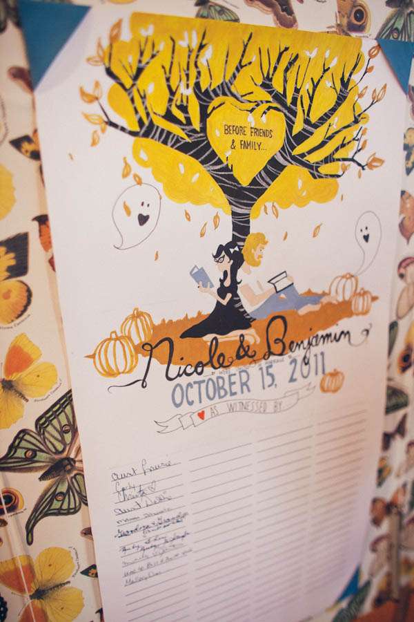 “Handmade, personal details were also really important. I’m a freelance illustrator, and knew I wanted to handle the making of all the invitations and whatever design elements I could myself. I designed our save-the-dates, shower invites, and wedding invitations and had them printed locally. One of the biggest projects I undertook was making a zine-style cookbook that served as both wedding favors and escort cards. I compiled, edited, and illustrated it and it’s filled with some of our most-made, best-loved, and fondest memory-inducing recipes, including Ben’s (who is a top notch baker) tried and true recipe for scones with lemon curd, our most memorable Christmas dinner, and a friend’s pumpkin bread recipe I used to nibble on in the library during cram-week in college. The silly hungry ghost illustrations inside match the ghouls featured on our invitations. I also cut out some speech bubbles from foam core for silly photos, and the ‘I do/Me too’ photos have turned out to be unanimous favorites. My friend and bridesmaid helped make a ‘just married’ banner and my mom was my patient ally in selecting perfectly shaped pumpkins and lugging them around in a heat wave.”