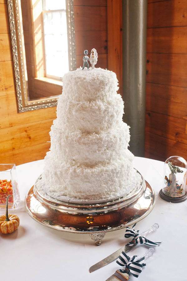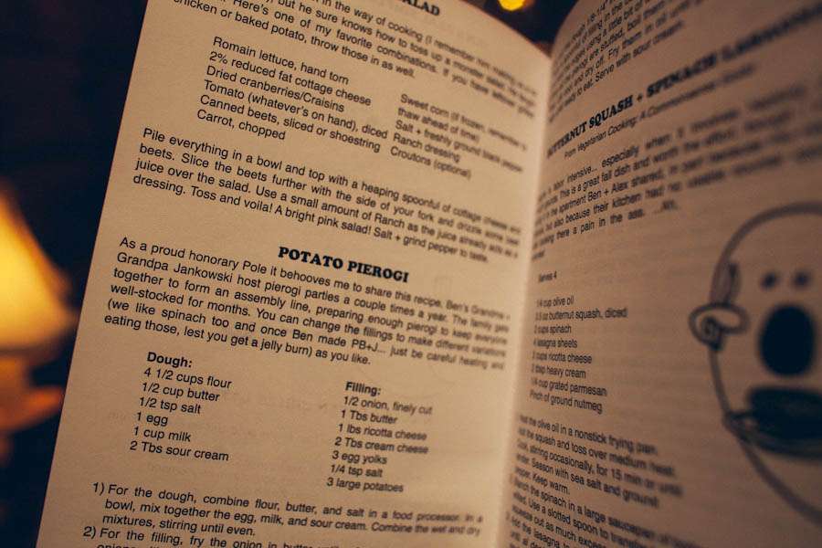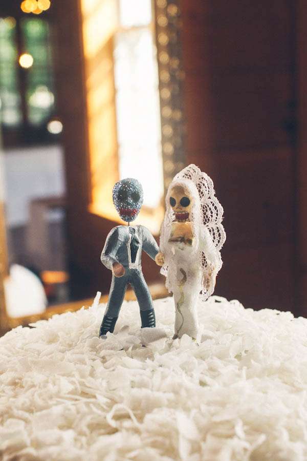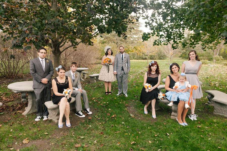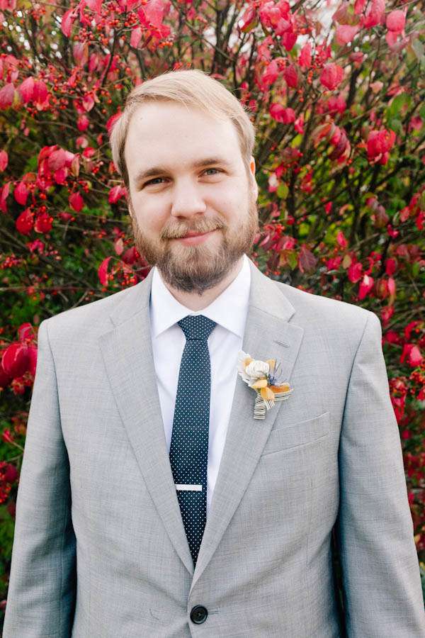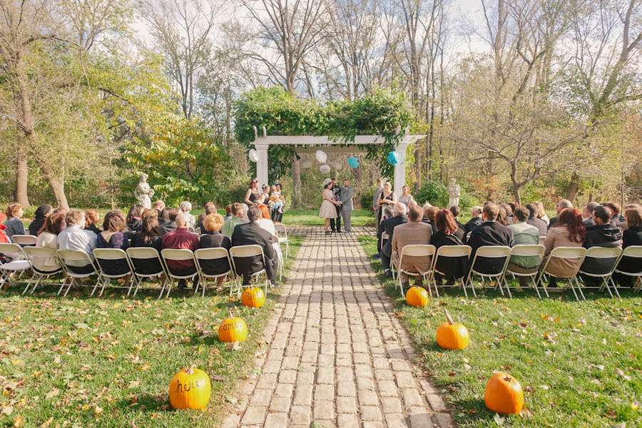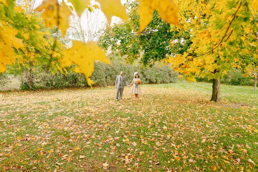 “Handmade, personal details were also really important. I’m a freelance illustrator, and knew I wanted to handle the making of all the invitations and whatever design elements I could myself. I designed our save-the-dates, shower invites, and wedding invitations and had them printed locally. One of the biggest projects I undertook was making a zine-style cookbook that served as both wedding favors and escort cards. I compiled, edited, and illustrated it and it’s filled with some of our most-made, best-loved, and fondest memory-inducing recipes, including Ben’s (who is a top notch baker) tried and true recipe for scones with lemon curd, our most memorable Christmas dinner, and a friend’s pumpkin bread recipe I used to nibble on in the library during cram-week in college. The silly hungry ghost illustrations inside match the ghouls featured on our invitations. I also cut out some speech bubbles from foam core for silly photos, and the ‘I do/Me too’ photos have turned out to be unanimous favorites. My friend and bridesmaid helped make a ‘just married’ banner and my mom was my patient ally in selecting perfectly shaped pumpkins and lugging them around in a heat wave.”