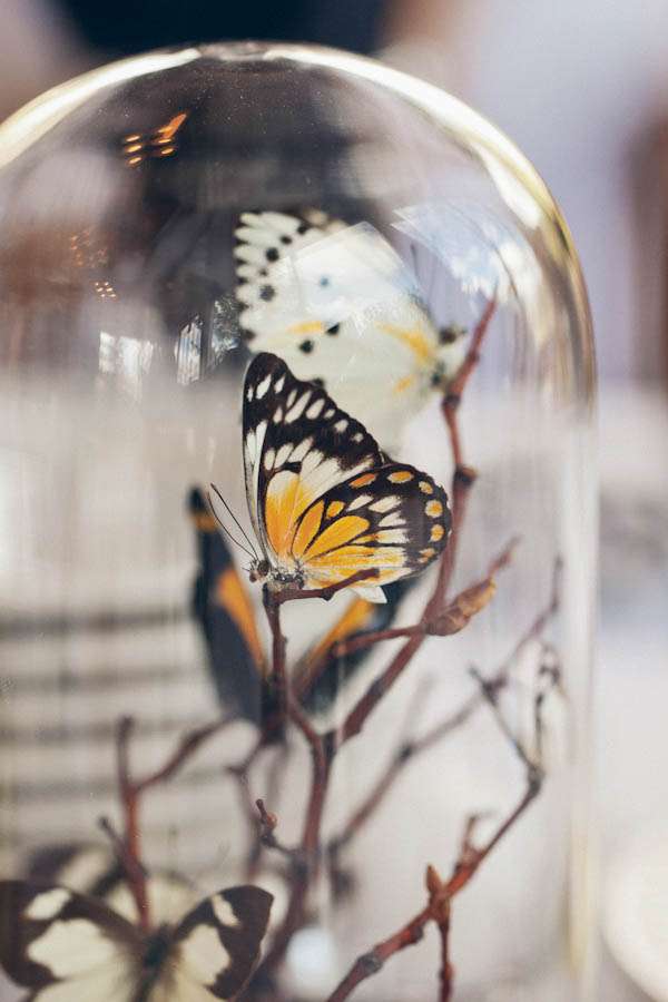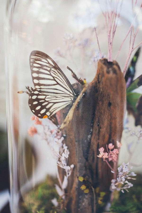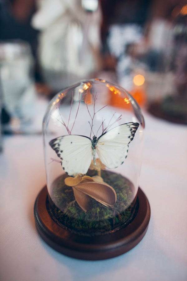 The butterfly centrepieces were also a handmade effort and had significance to Nicole and her family. She explained, “My sister Michelle has an insect display business she started about two years ago called Alfred & Alma’s Insect Shoppe. Before a date, location, or dress were decided on, I knew I wanted Michelle to create butterfly (and some beetles, though I had a strict no moth policy) filled domes for our centerpieces. She spent months selecting butterflies and beetles, collecting flora and bell jars, and created a total of 17 displays for our reception in various sizes. Not only were they beautiful and unique decor, they were lovingly created. Plus they seriously cut down on our flower budget and made great gifts for friends and family that had helped with the wedding.”
