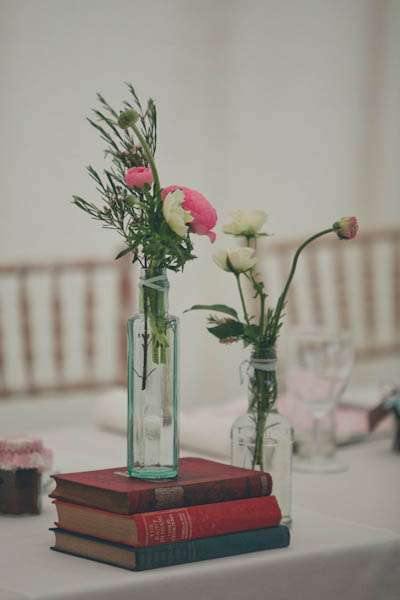 “ James and I both love all things whimsical and retro, and we’re big readers. So, I chose to use old books as our table centres. These were relatively easy to source through eBay and old book stores. I loved picking out ones with quaint and quirky covers! The flowers were then dotted around them in old jam jars and bottles. I love using these around my house, as it has the lovely ‘just from the garden’ feel, so I knew straight away that this was how they would be displayed. With the help of some kind friends and family, we quickly gathered together around 150 jars to be used as vases and also lanterns in the evening, which were painted a light rose pink colour and gave off a beautiful, warm glow. ”