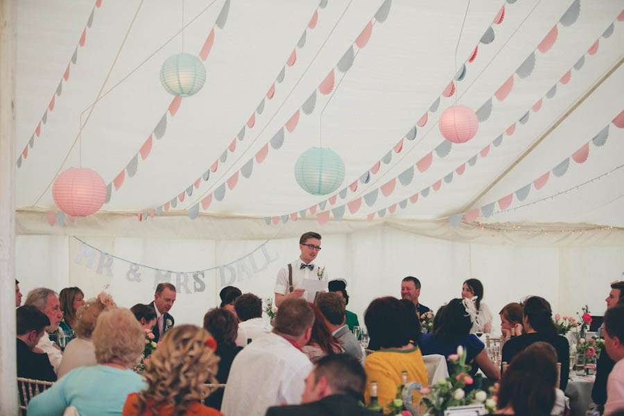 “I’m a very creative person and always have some sort of project on the go, so we always knew our wedding would be DIY heavy”, Emily continued. “Little did our wedding party know just how much they would be getting involved as well! I had seen beautiful ‘doily bunting’ on a couple of blogs, which involved taking a large doily and folding it in half over a pieces of cotton tape, and repeating to create bunting. This had the quaint look I was going for, but I was eager not to have them in white as I wanted to bring as much colour as possible into the blank canvas of the marquee. So, after much looking, it seemed near impossible to find doilies in the right shades of blue and pink, and it was then that I decided we would have to make them ourselves! I fashioned a template which worked, and my parents got stuck in at home, with various family members, creating a production line of doily bunting. They were fantastic and I think we ended up with approx. 300 metres of it! ”