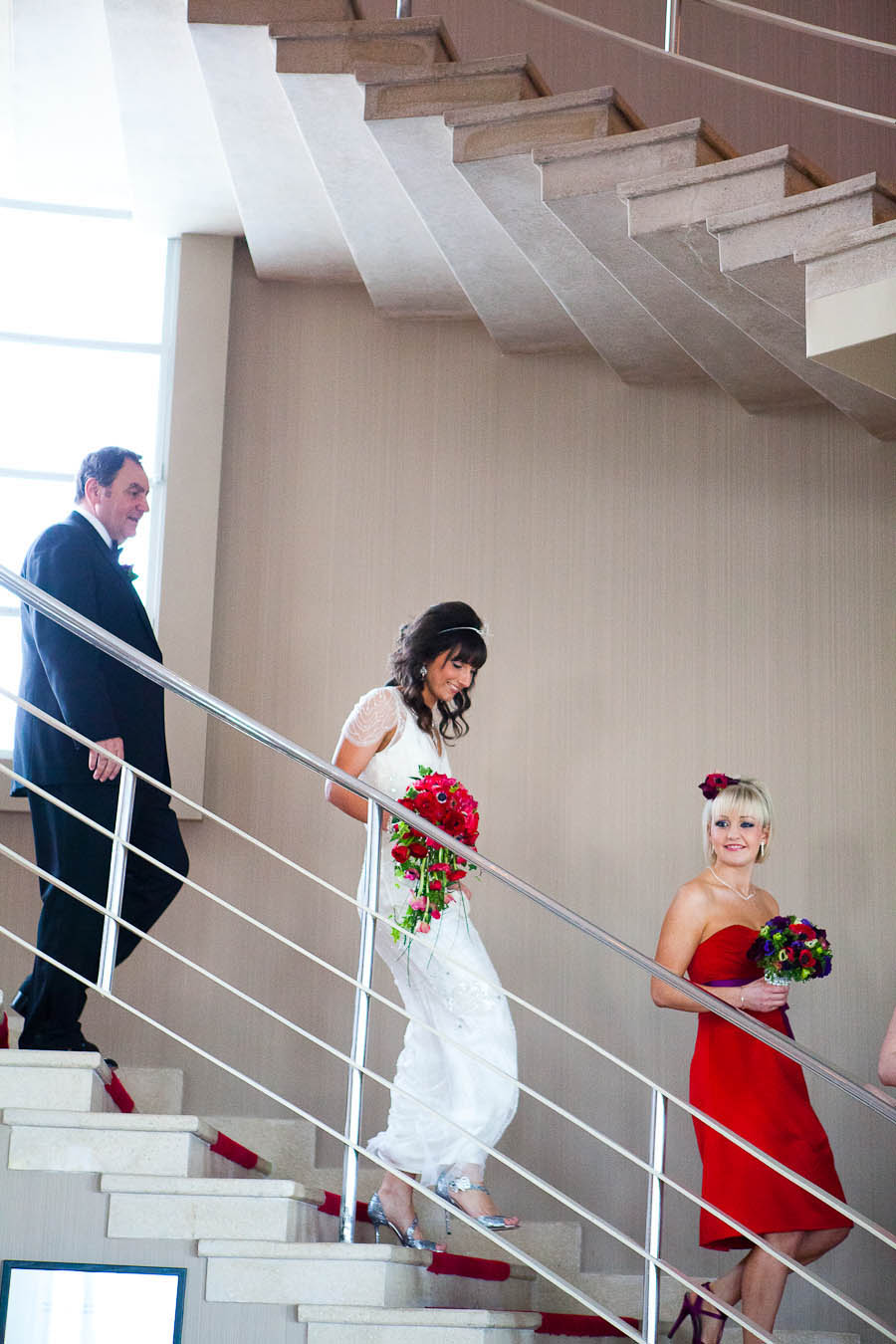 The bride wore a gorgeous Jenny Packham wedding dress and as anticipated, the bridesmaids stood out and looked spectacular in their red and purple Dan Kerr cocktail dresses and matching bouquets. “I wanted poppies but everyone told me they die too quickly so our florist suggested red anemones”, Hayley explained. “When I started researching anemones I just loved the bright colours they came in (red, purple, blue, pink, ivory) so decided to incorporate all these colours in the bridesmaids, who all had different mixed bouquets with different coloured flowers in their hair too.”