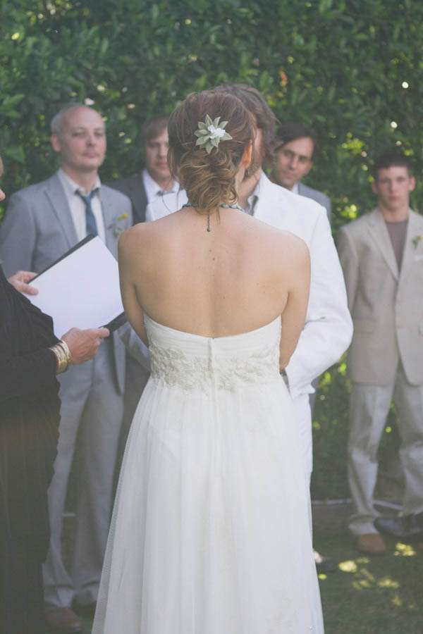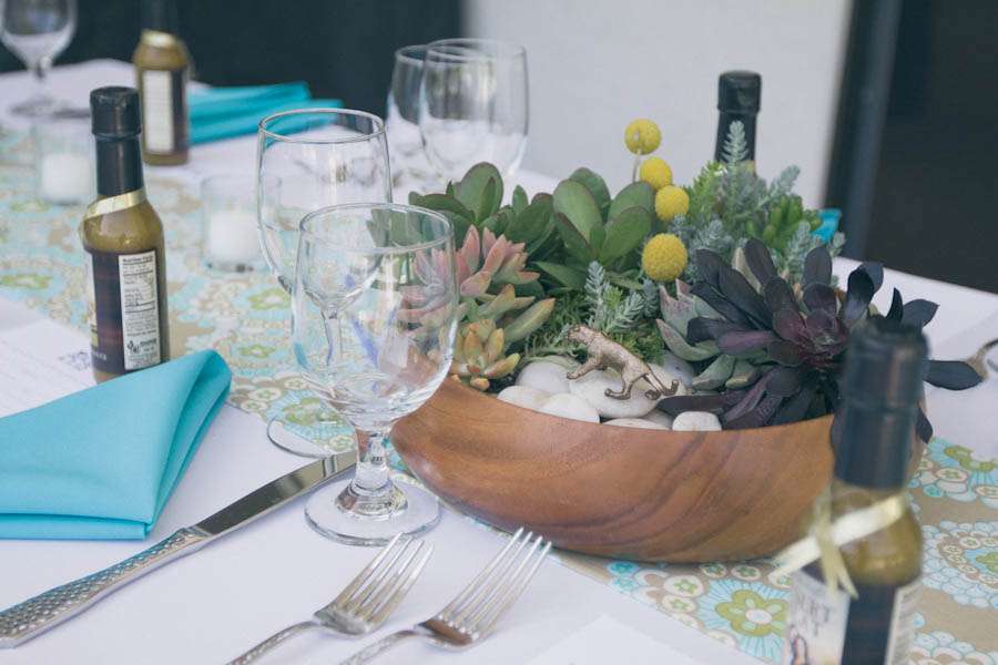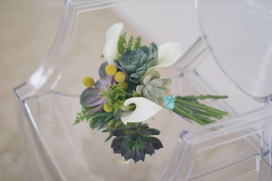 “The most rewarding DIY experience was creating the succulent/flower combo bouquets and table arrangements”, the bride concluded. “I made the table arrangements out of vintage monkey pod trays and bowls and planted succulents with little Craspedia accents. They were perfect for me because I basically have a black thumb and needed to make something virtually impossible to kill. It was no easy feat but I’m really happy with how they turned out. There was a lot of prep and timing involved, but the greatest part about it is all my bouquets and table arrangements are planted now in the garden and in containers displayed on our deck or given to those who took part in the wedding. Succulents are great because of their heartiness. I was so busy with life after the wedding that I didn’t replant them for almost 4 weeks and they completely held up.”