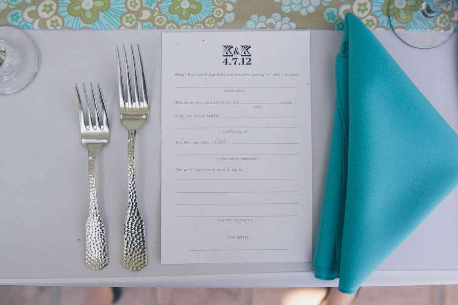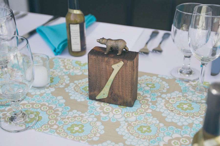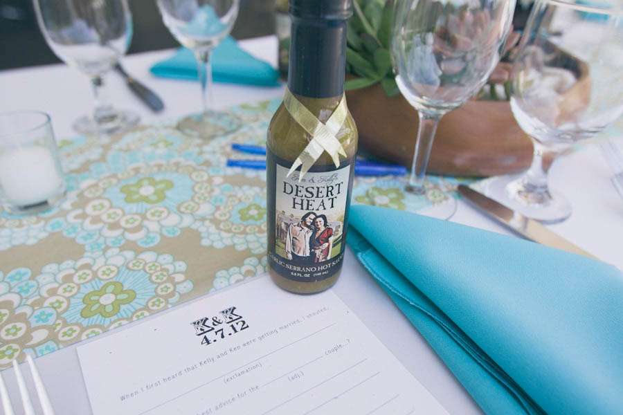 The couple added DIY elements to enhance the day. These included custom hot sauce as wedding favors to fit in with their Mexican themed dinner, the table runners and the spray painted animal figurines. “I also did a lot with small wood-working projects”, Kelly explained. “The test tube vases, table numbers, etc were all very simple and inexpensive wood projects. I also designed and printed all the paper goods to save cost: escort tags, ad-lib questionnaires (in lieu of traditional guest book) and programs.”