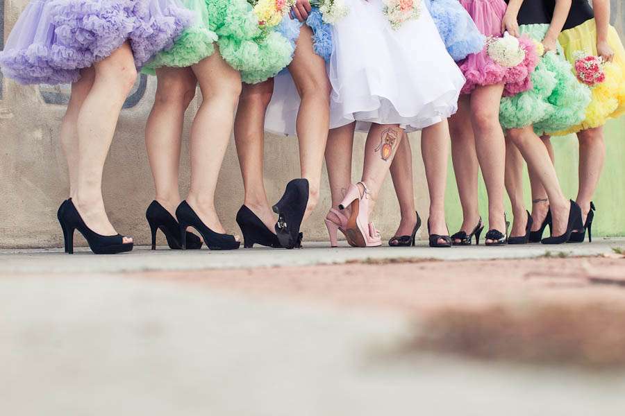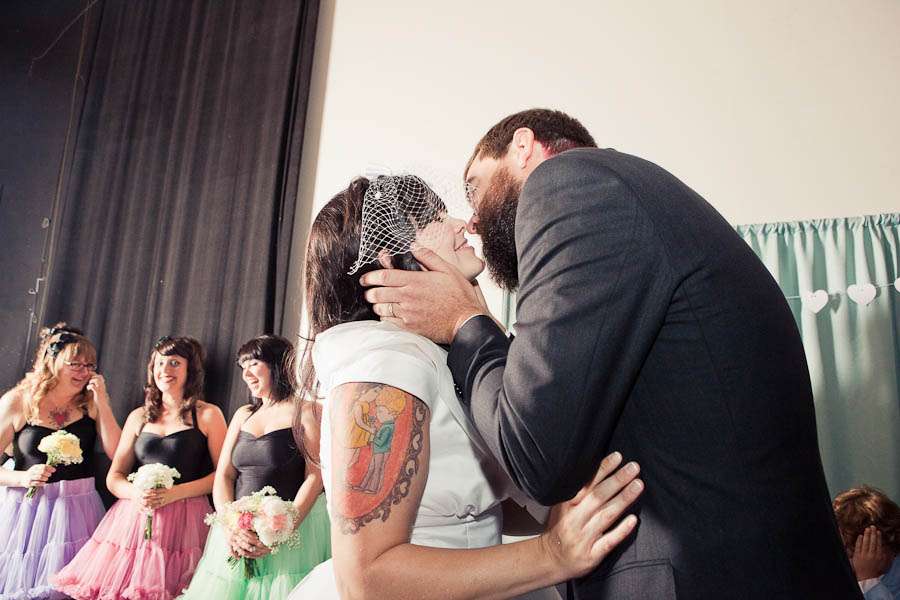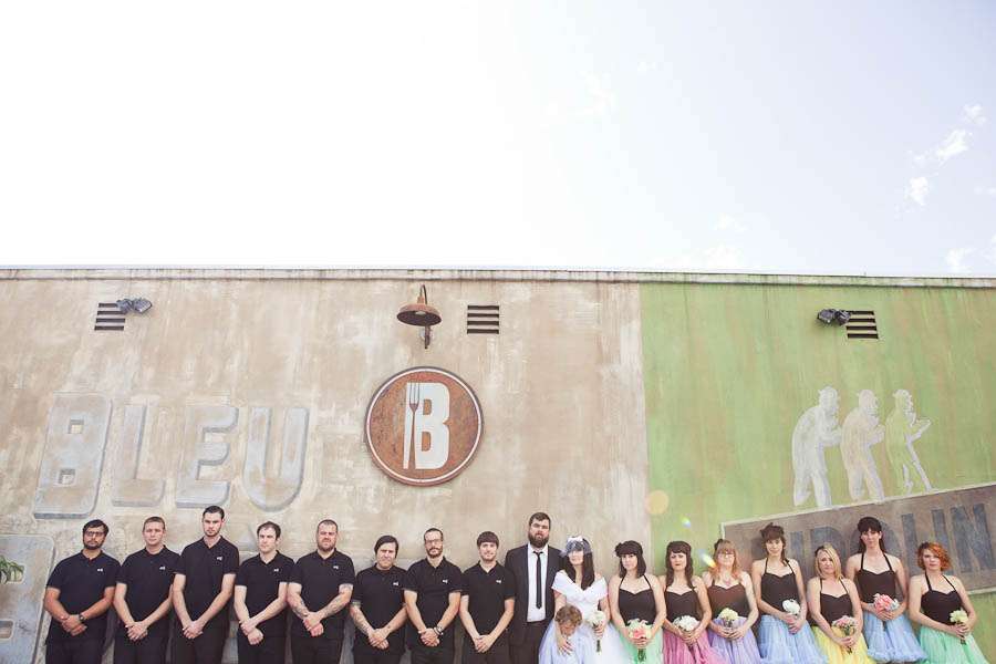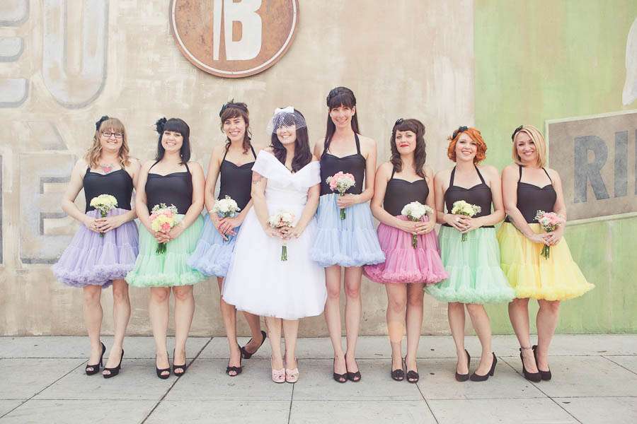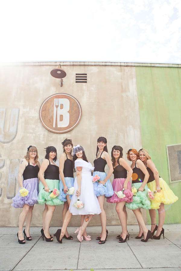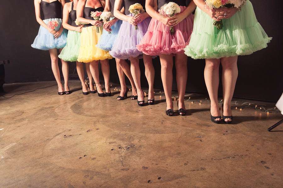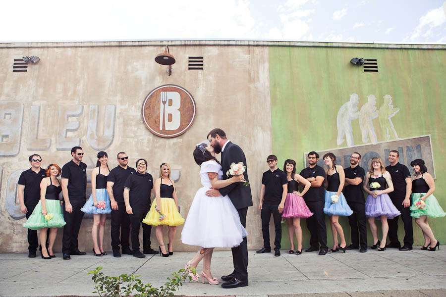 “I had to keep reminding myself that there is no right or wrong way to plan your wedding”, began newlywed Lynn. “This day just had to fit our personalities, and be what we wanted. We mixed old with new and handmade the rest. Our friends took turns being DJ, our favorite restaurant catered. I’m a fashion designer so I made the bridesmaid dresses (the tutus came from etsy). The colors I chose for them set the color palette for the entire wedding. The band we chose were the ones that were playing when we first fell in love.”