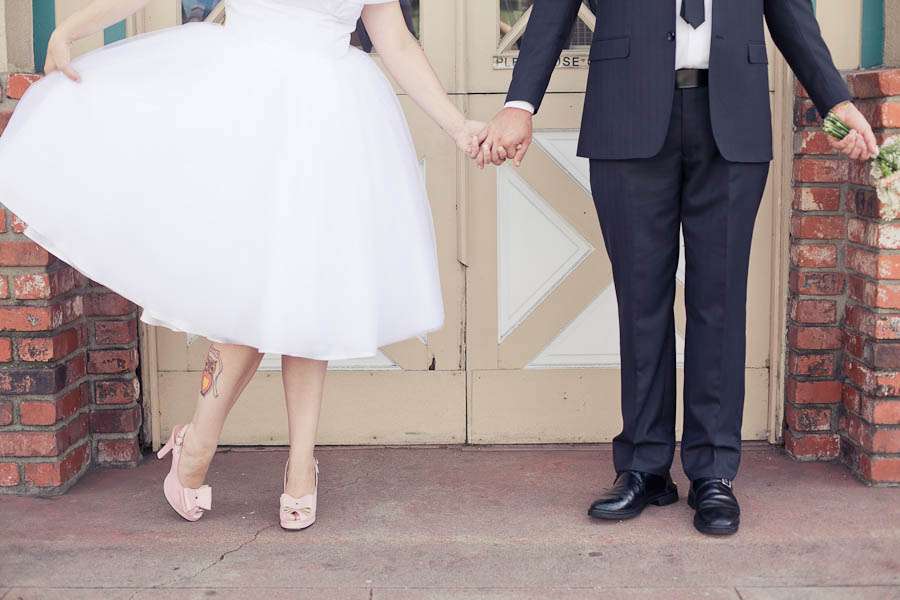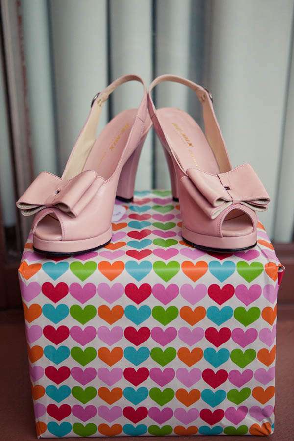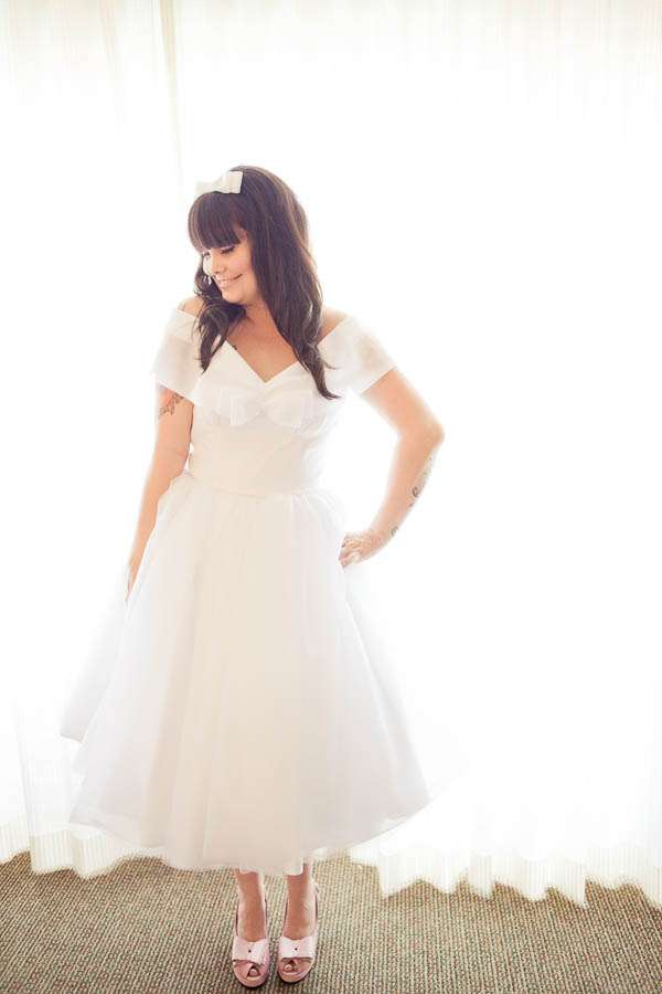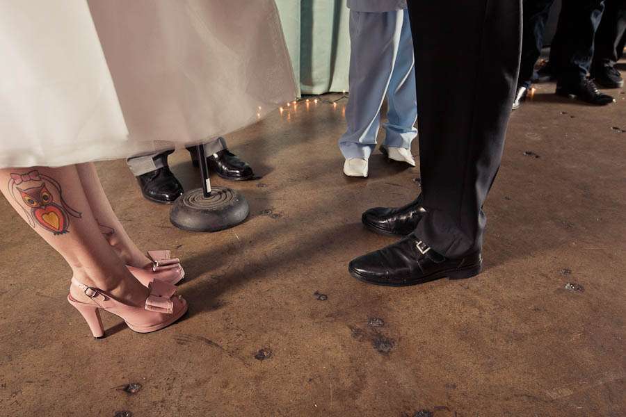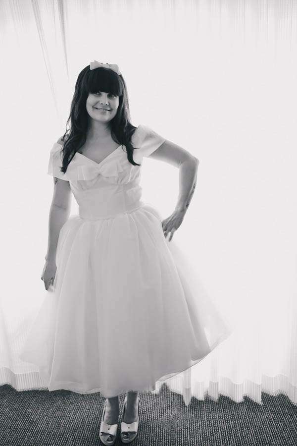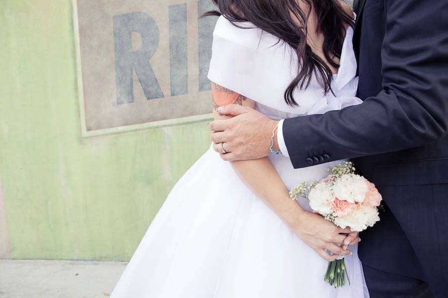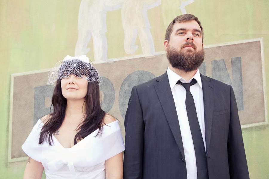 “I had to keep reminding myself that there is no right or wrong way to plan your wedding”, began newlywed Lynn. “This day just had to fit our personalities, and be what we wanted. We mixed old with new and handmade the rest. Our friends took turns being DJ, our favorite restaurant catered. I’m a fashion designer so I made the bridesmaid dresses (the tutus came from etsy). The colors I chose for them set the color palette for the entire wedding. The band we chose were the ones that were playing when we first fell in love.”