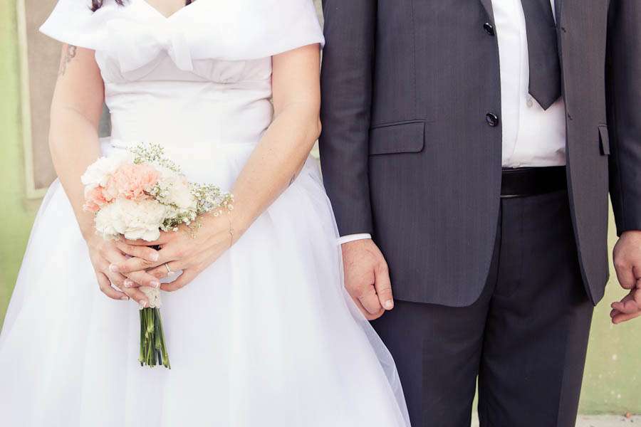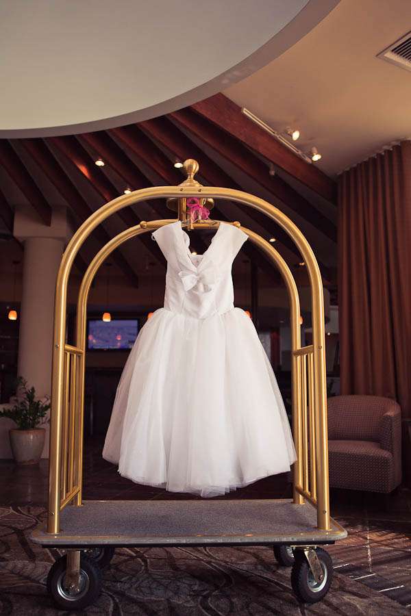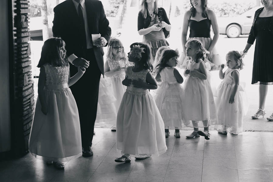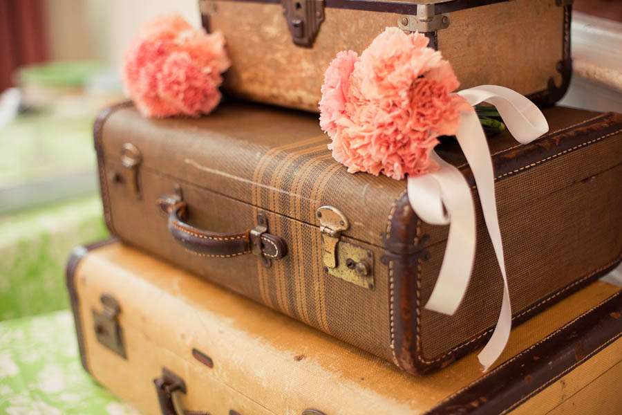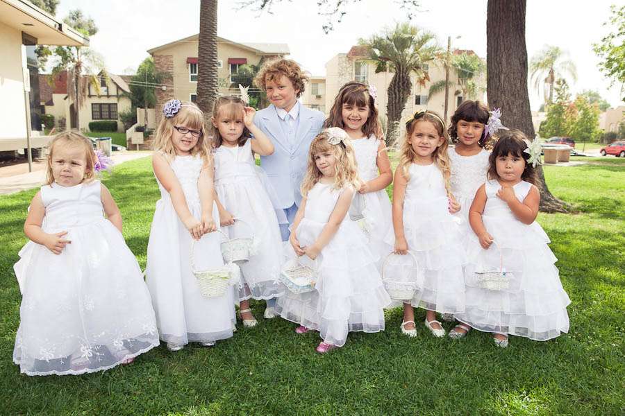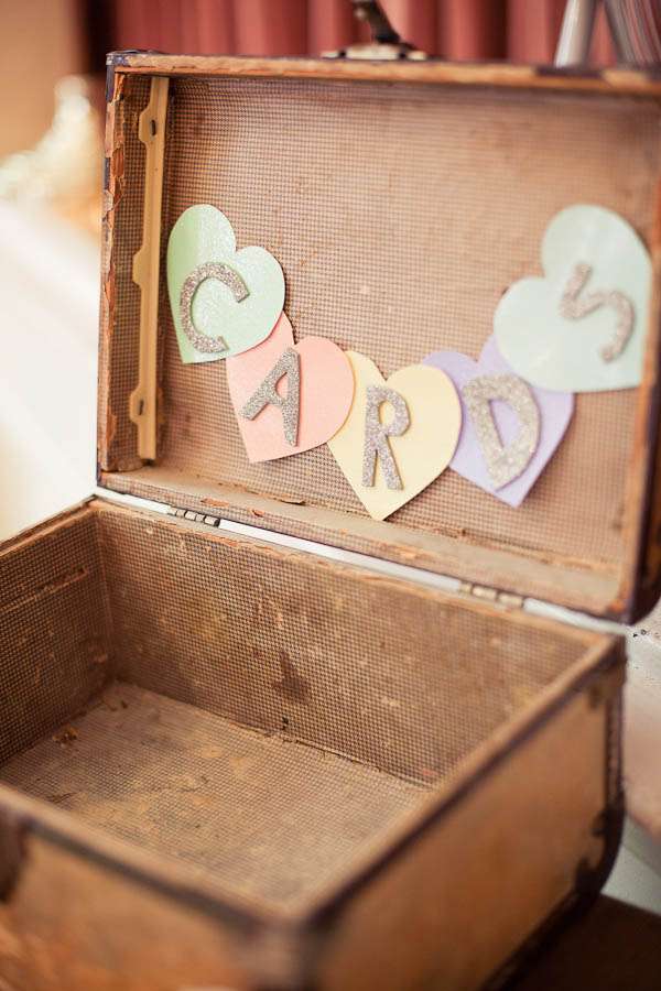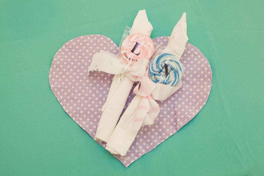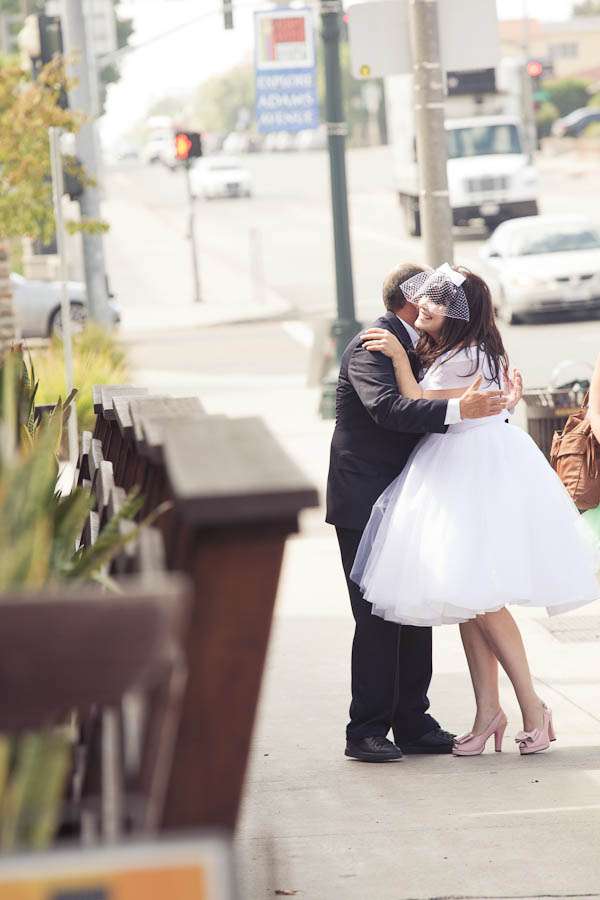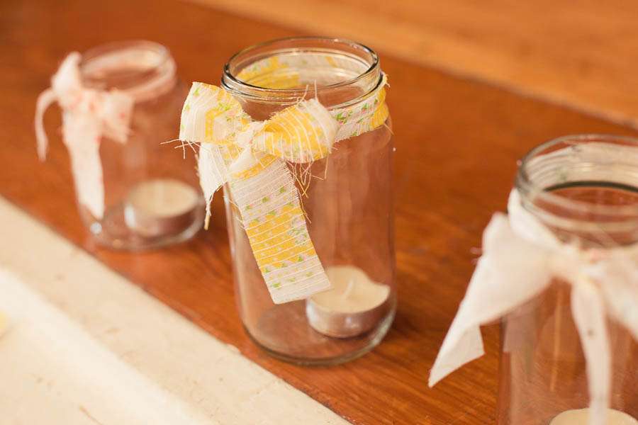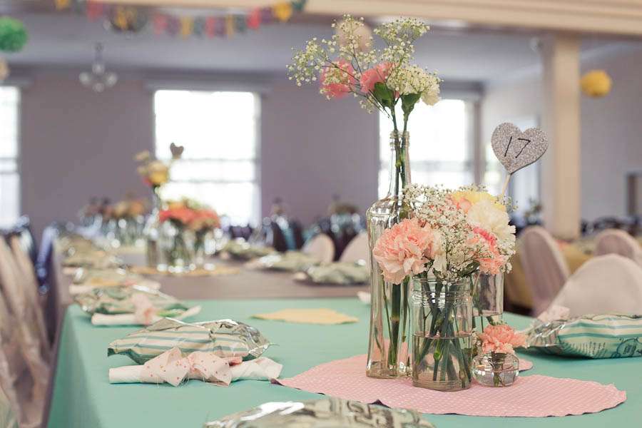 As well as the bridesmaid’s dresses, the bride DIY’ed as much as possible. “I made my own tablecloths from pastel fabric I picked up while shopping in the LA Garment District – it was cheaper than renting and they added pops of color that coordinated with the bridesmaid dresses. I also recommend doing your own flower arrangements. We picked up our carnations and baby’s breath at the local floral market the night before the wedding and I put the bouquets together. For table centerpieces, I collected miscellaneous glass jars for months prior to the wedding. My whole family was up in the morning filling old jars with flowers! It was much cheaper and so much fun to do. I dug into my scrap fabric bin and pulled a few pieces of coordinating vintage floral and polka dot. Some of the bigger pieces I sewed into hearts to place on the long tables and use a base for the centerpieces, and the smaller scraps were cut into strips for rag bows tied onto the glass jars and flatware.”
