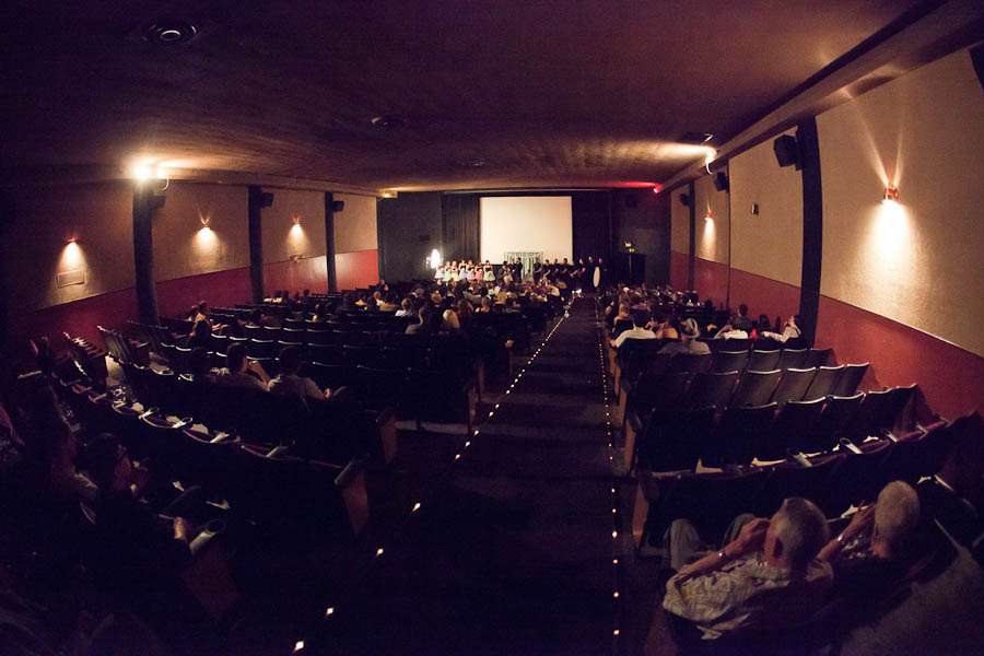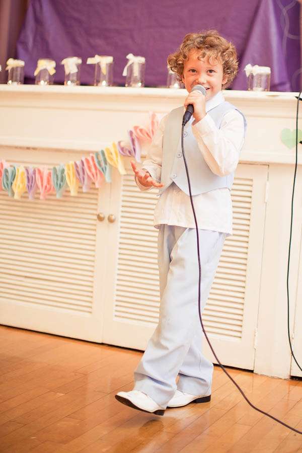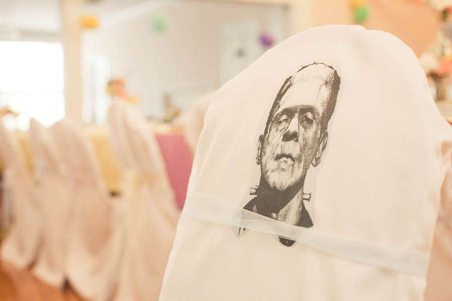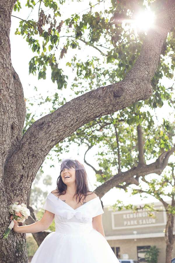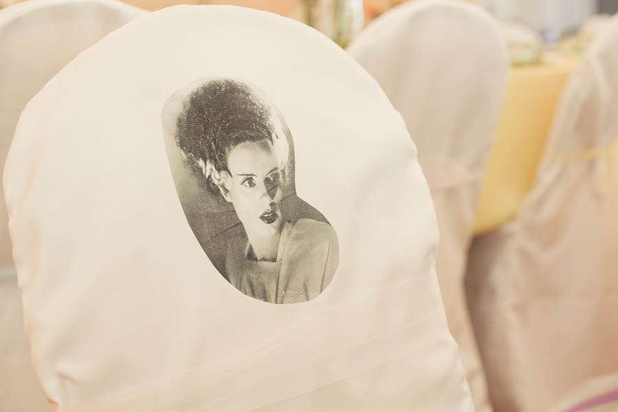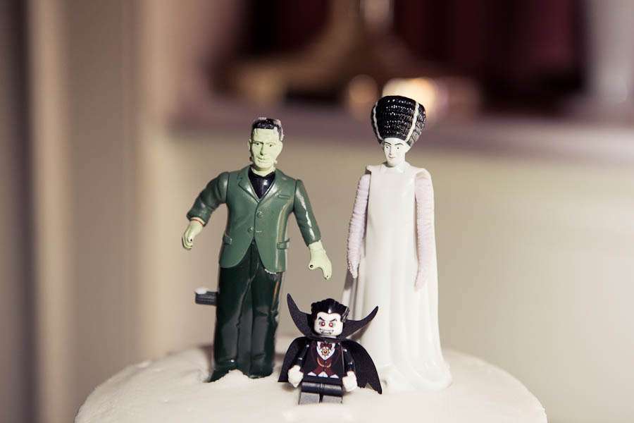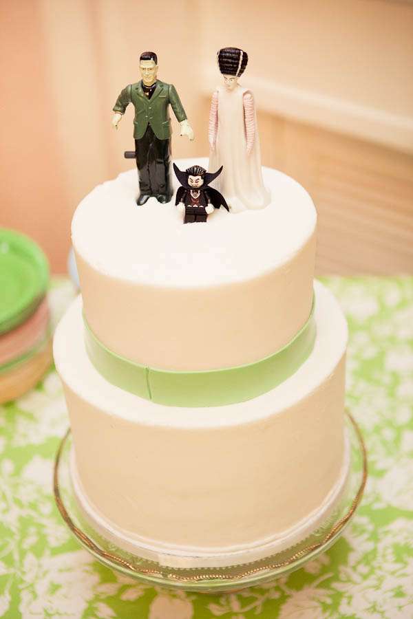 “We wanted our wedding to be fun and meaningful,” she continued. “Mostly we wanted it to feel like ‘us’. We LOVE movies and everything old, so we decided to get married at the vintage Ken Cinema which was built in 1912. Family was also a huge deal to us. Our invitations read, ‘Please join us as we become a family’. My 7 year old son Owen became best friends with his new step dad immediately. We felt as though we were all getting married, so we included Owen as much as possible. He was the best man as well as the ring bearer and he wore a vintage powder blue suit. He said the words, ‘you may now kiss the bride’ and made a toast at the reception that consisted of a knock knock joke. He was even on the top of the wedding cake with us, depicted as a baby vampire.”