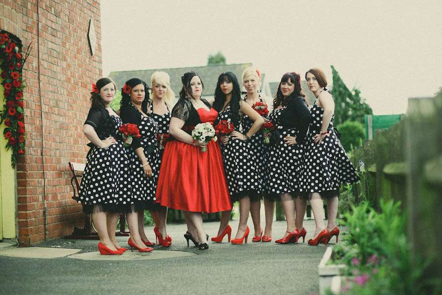 Suzie wore a short red dress which she bought from Honeypie Boutique, with Vivinene Westwood/Melissa shoes and a homemade headpiece. Andrew hates wearing suits so he opted for jeans, a studded belt, a faded denim shirt and creepers! Suzie wanted her bridesmaids to be comfortable and look their best. She found their dresses on eBay but told them they could accessorise however they liked.