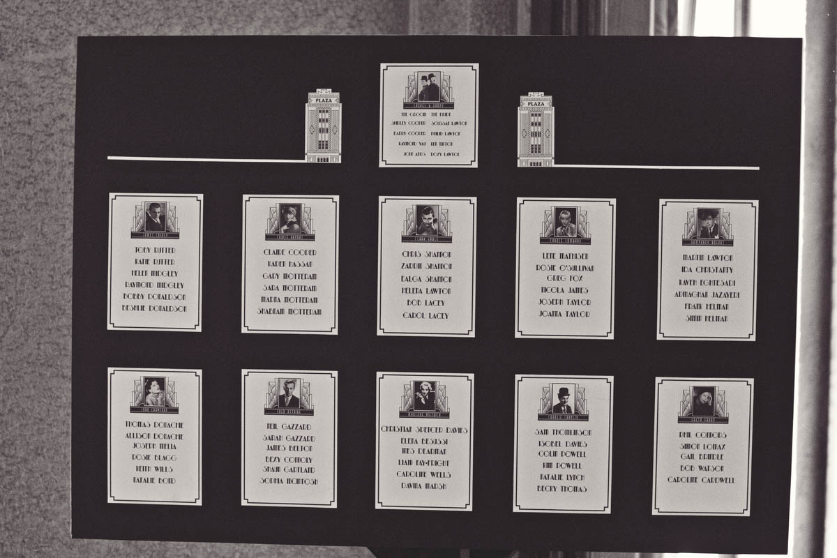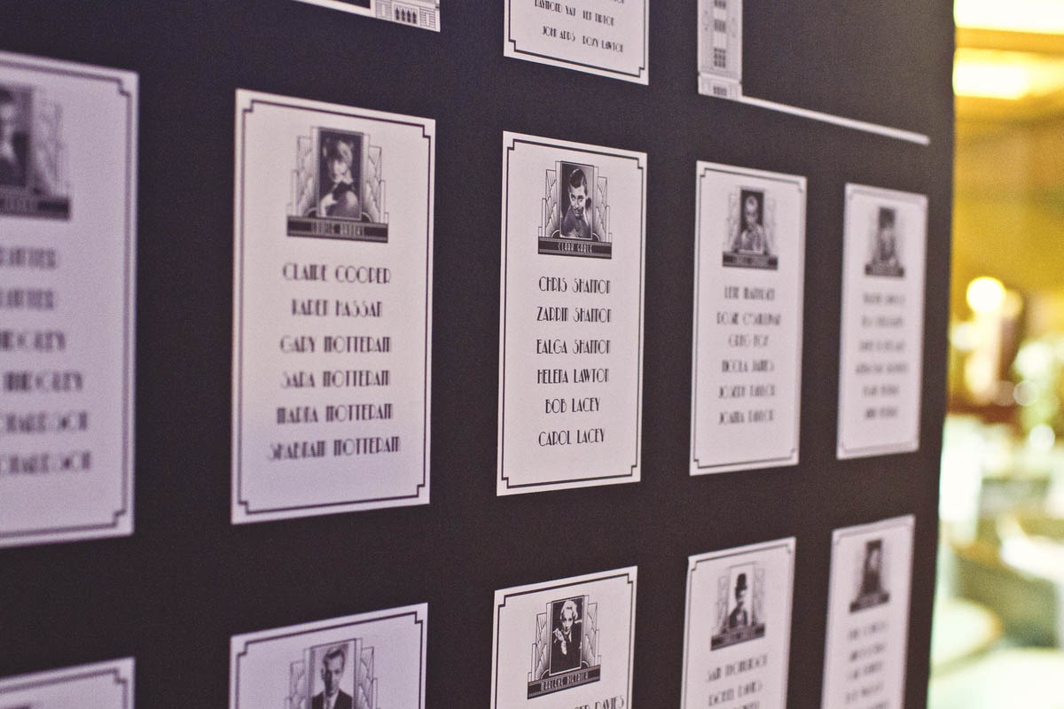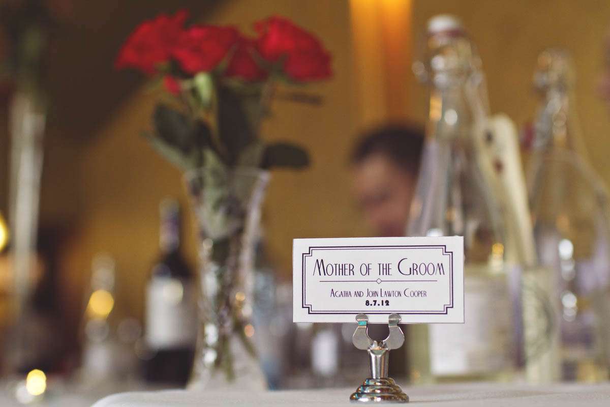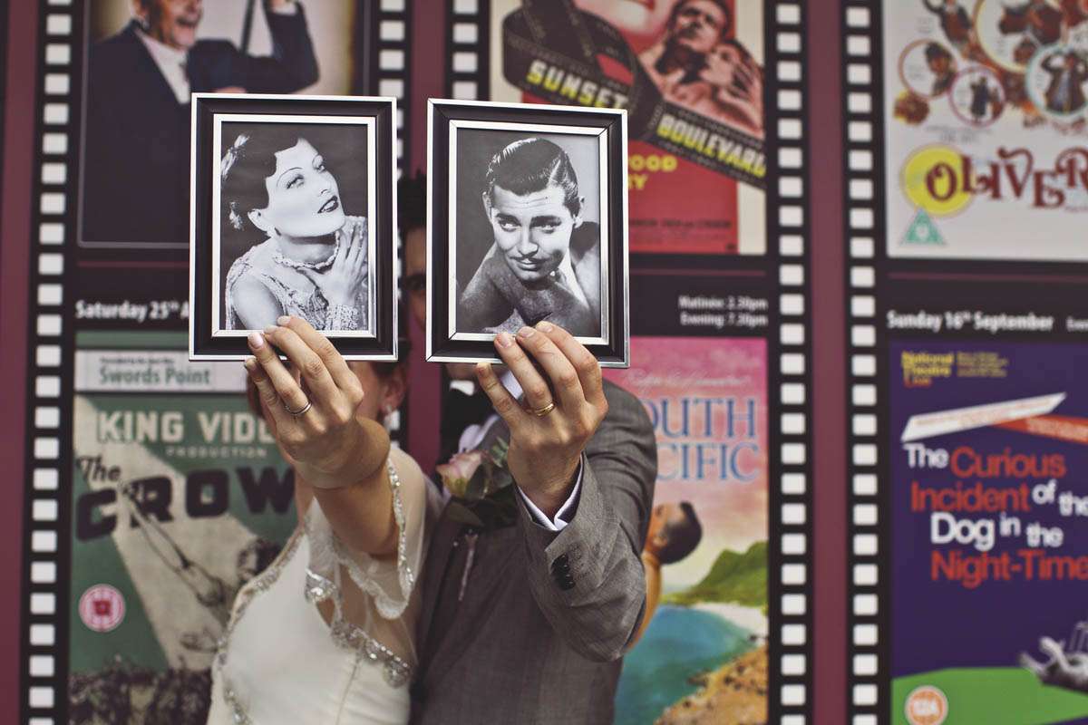 The couple knew they wouldn’t have to go overboard with the decorations as the venue was already so beautiful, but what they did choose needed to compliment the space. “We decided to have our tables named after 1920s & 30s actors and actresses”, Aggie explained. “We googled them and picked our favourites we then popped them in frames. John is an art and design teacher and used to work doing costumes for movies and model making. He did all of the wonderfully art deco wedding stationery.”