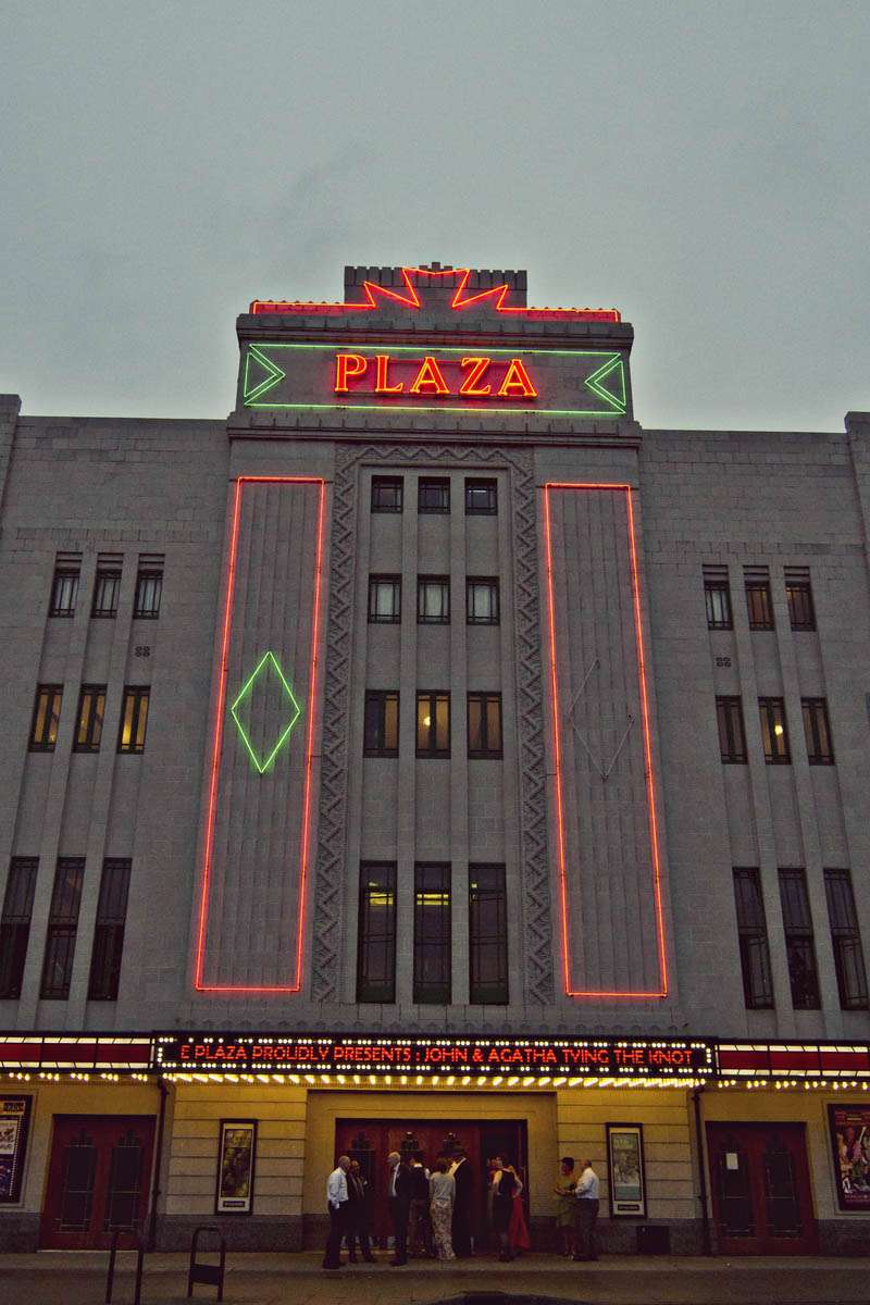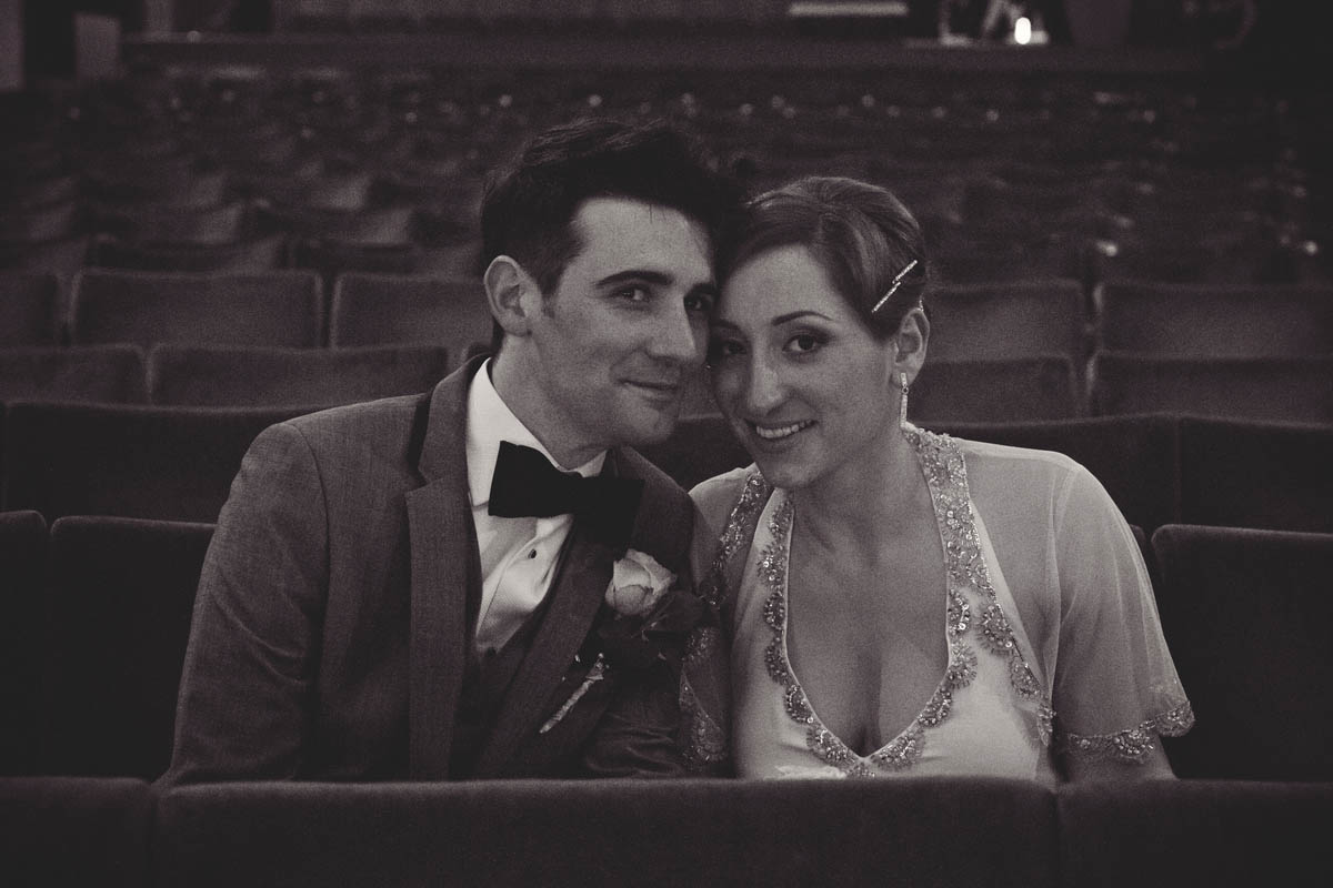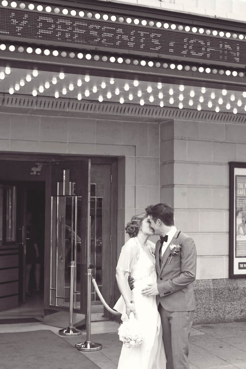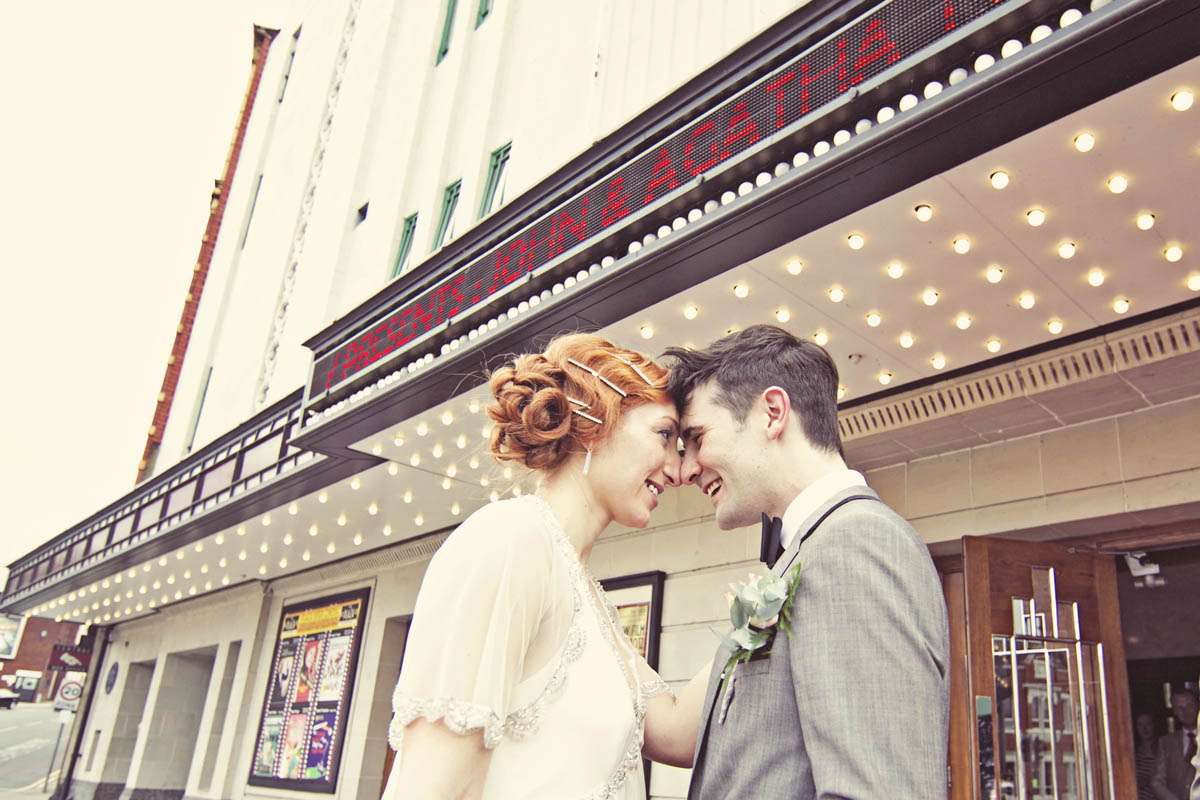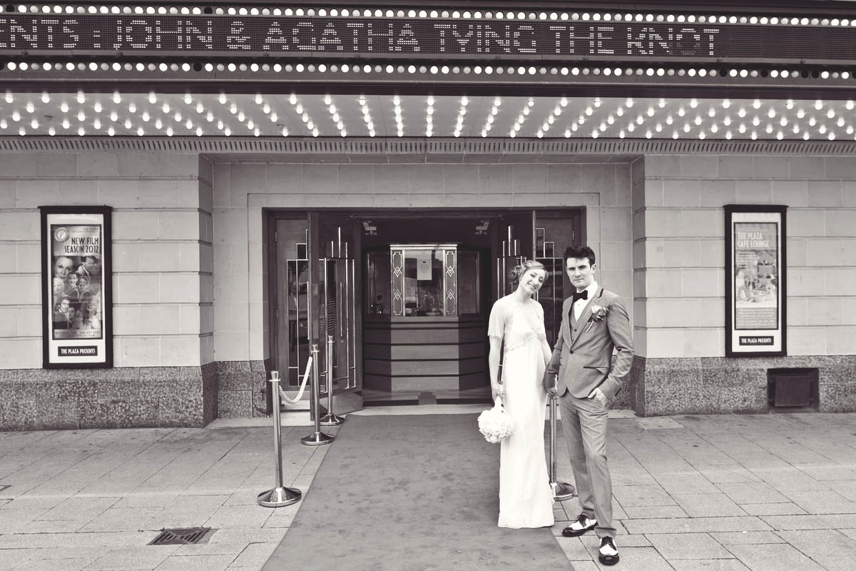 “I have always been captivated by and idolised the 1920s it may have something to do with my namesake (Agatha Christie) but I just love anything art deco the geometric lines and silhouettes”, Aggie continued. “John and I got engaged in Marrakech on New Year’s eve 2011 and originally I had always said that I would run away and get married somewhere exotic on a beach and have a very simple wedding. But we soon realised that our families would be disappointed if we did this and that elderly relatives wouldn’t be able to join us. For a Valentine’s treat I dedicated to book us tickets at the Plaza cinema for a dinner and to then watch the designated valentines movie ‘an affair to remember’. I’d always loved the Plaza since we discovers it year or so ago and we would occasionally pop in for afternoon tea in the tearooms. Seeing the Plaza at the Valentine’s night all decked out and with the lights a warm red made us think perhaps we could have our wedding there. We decided to track down Ted, the General manager, that night to enquire about the venue. Ted and his team were just brilliant with helping us to arrange the order of events and how things would work. They only had two dates remaining for the whole of 2012 – one in August which was already another of our friends’ wedding dates and the other which was Sunday 8th July – just four months away! We took it and decided that we had better get planning!”