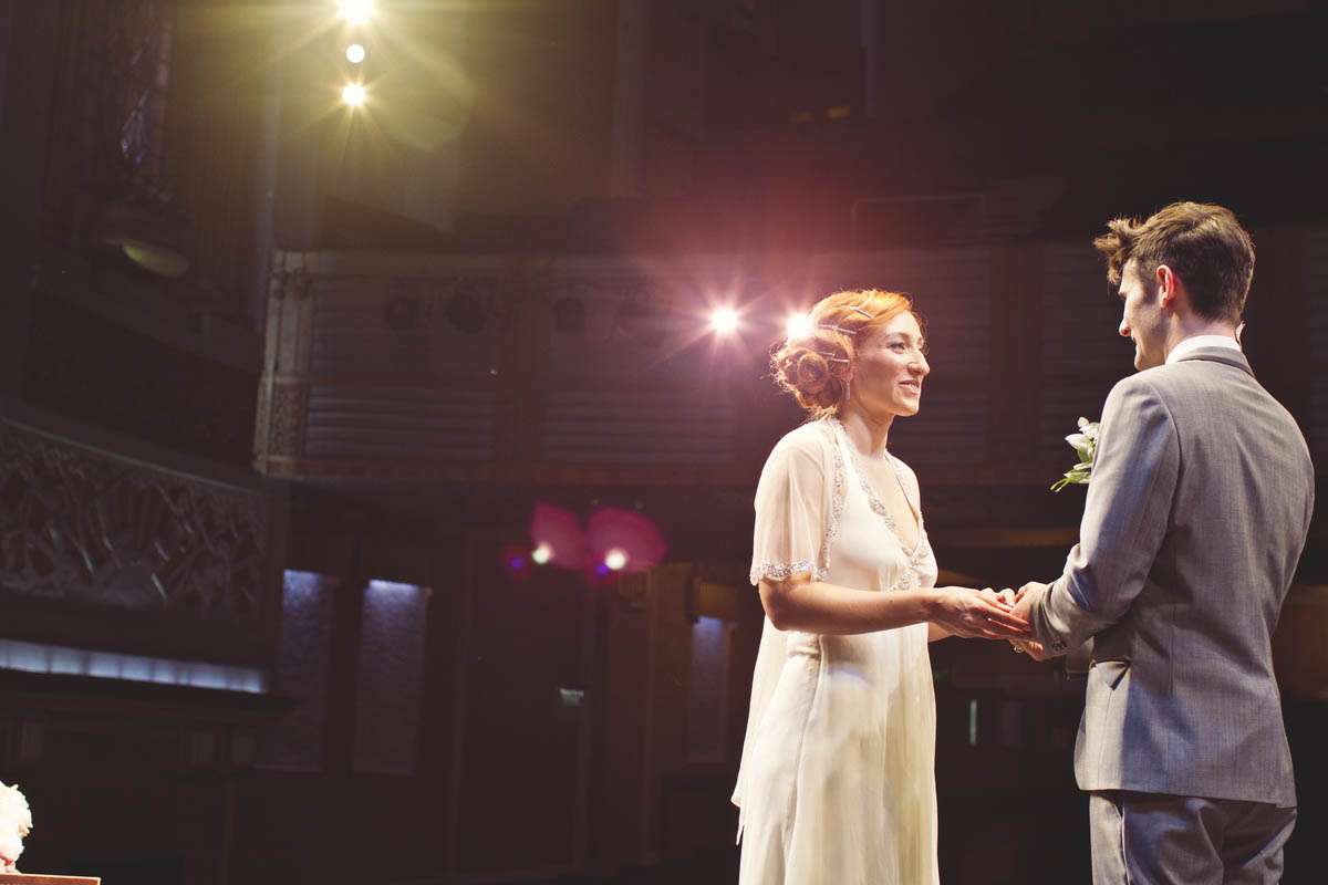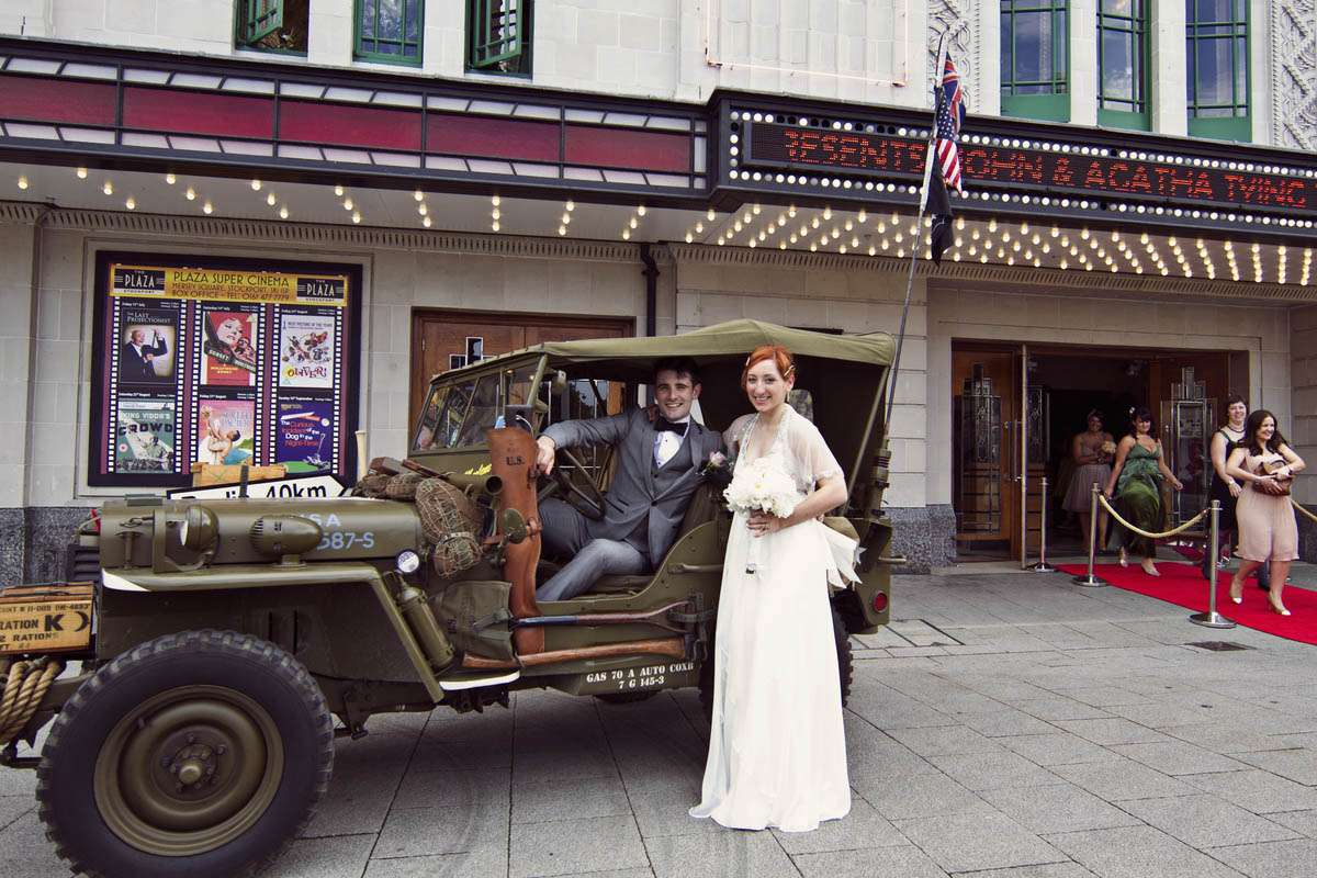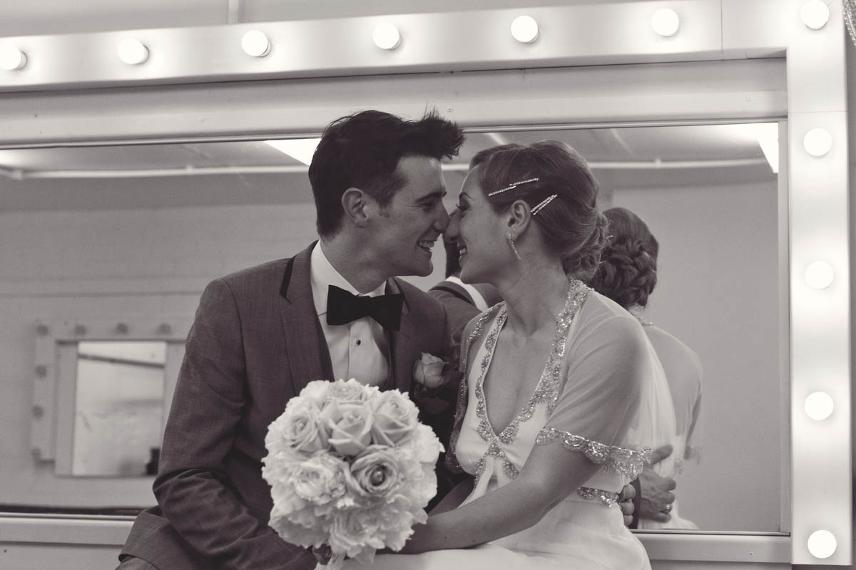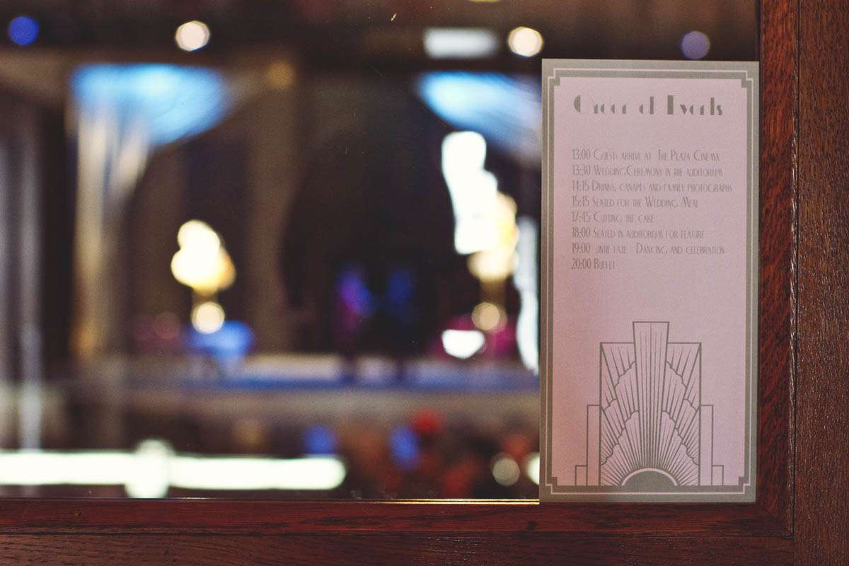 “I have always been captivated by and idolised the 1920s it may have something to do with my namesake (Agatha Christie) but I just love anything art deco the geometric lines and silhouettes”, Aggie continued. “John and I got engaged in Marrakech on New Year’s eve 2011 and originally I had always said that I would run away and get married somewhere exotic on a beach and have a very simple wedding. But we soon realised that our families would be disappointed if we did this and that elderly relatives wouldn’t be able to join us. For a Valentine’s treat I dedicated to book us tickets at the Plaza cinema for a dinner and to then watch the designated valentines movie ‘an affair to remember’. I’d always loved the Plaza since we discovers it year or so ago and we would occasionally pop in for afternoon tea in the tearooms. Seeing the Plaza at the Valentine’s night all decked out and with the lights a warm red made us think perhaps we could have our wedding there. We decided to track down Ted, the General manager, that night to enquire about the venue. Ted and his team were just brilliant with helping us to arrange the order of events and how things would work. They only had two dates remaining for the whole of 2012 – one in August which was already another of our friends’ wedding dates and the other which was Sunday 8th July – just four months away! We took it and decided that we had better get planning!”