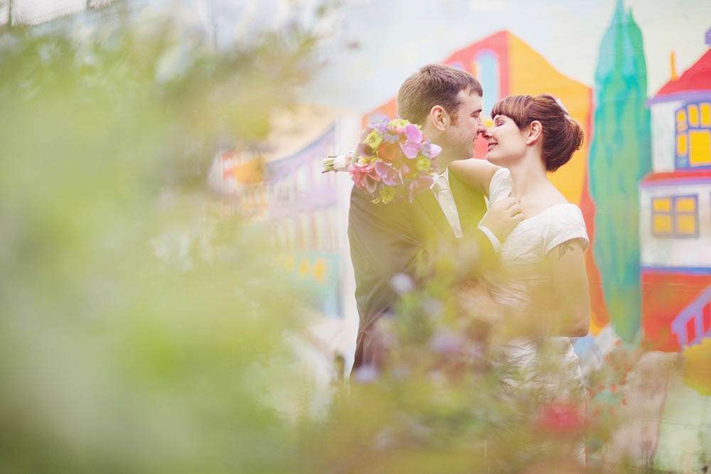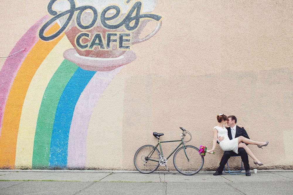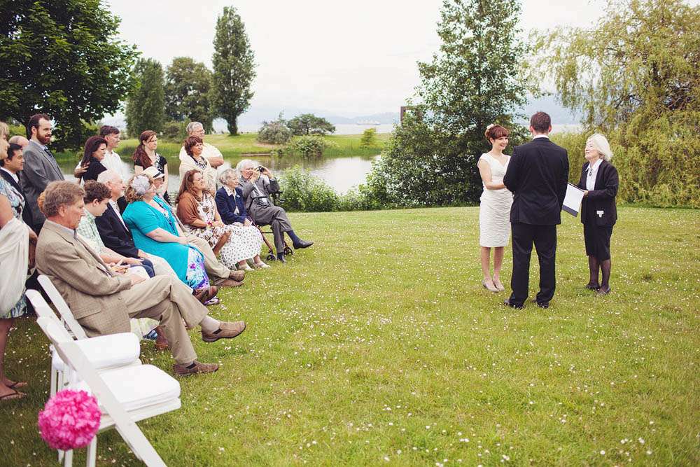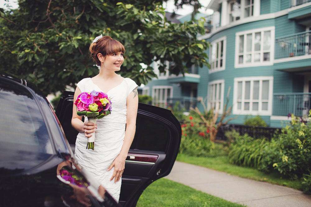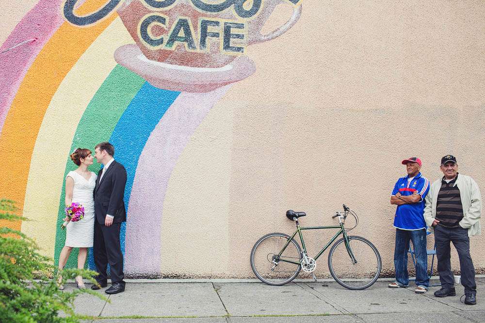 “Teresa & Russell’s wedding was like an elopement which included family and close friends”, wrote wedding photographer Melina of Lucinda Photography. “They left their East Vancouver home with suitcases packed for their Montreal honeymoon for which they were leaving only a couple of hours after the ceremony! We did some whirlwind portraits in their neighbourhood before heading to Vanier Park to help friends set up some chairs and refreshments. Guests arrived, they were married, the mingled and they left. It was great.”
