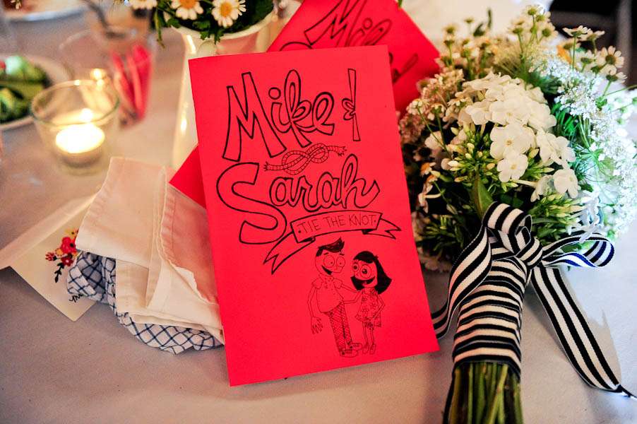 “There’s so much that I’d describe as our favorite parts of our day”, Sarah concluded. “When Mike and I were dancing our first dance, Morrissey’s cover of Moon River, I looked up and saw fireworks lighting up the sky through the barn windows – it was perfect (and not planned!) It was also really special to us that so many of our friends were willing to offer their time and talents for the wedding for the wedding; everyone was so helpful, hardworking, kind, and generous. Our good friend, Aram Arslanian, who had introduced Mike and I through e-mail 4 years ago, was kind enough to be our wedding officiant which meant so much. Finally our Best man, Ev, created an amazing coloring and activity book for the children at the wedding. The pictures told they story of Mike and I meeting, moving in together, getting Milo (our dog), buying a home, and tying the knot!”