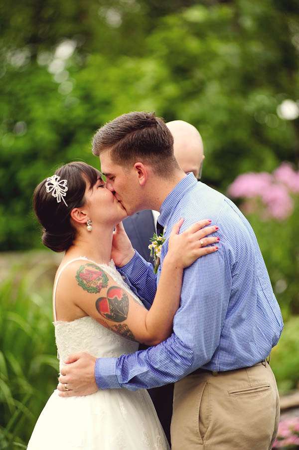 Over half of the 140 wedding guests were vegan or vegetarian so obviously this had to be a feature of the wedding. “We had over 60 guests eat the vegan and vegetarian options at our wedding”, Sarah explained. “Our menu consisted of ‘chicken’ salad sandwiches, pulled ‘pork’ BBQ sandwiches and potato and macaroni salad. When we met with our caterer, we brought as much information as we could, like vendors, pricing, quantities, and recipes. This was the first vegetarian/vegan menu they’d ever done and we were concerned about overwhelming them. Despite our concerns, they killed it! Throughout the reception, we were approached by many guests who were happy to report that it was the best vegetarian food they had ever enjoyed at a wedding!”