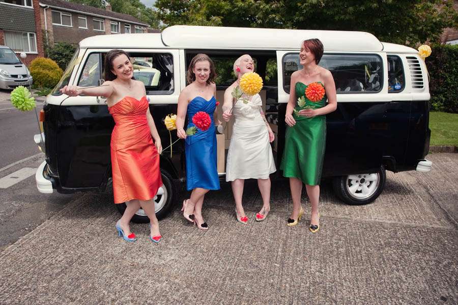 The bride wore a short wedding dress from Yours Truly Bridal Shop in Maidstone which cost her just £180 with a gorgeous headpiece was by a Rock n Roll Bride favourite, Crown & Glory. Alongside her lucky bridesmaids, she wore Vivienne Westwood/Melissa Lady Dragon shoes and instead of bouquets they all carried a single giant faux flower stem, bought from Hobbycraft costing just £2 each!