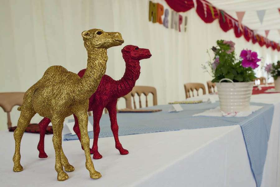 “We bought two old sofas and a coffee table from the British Heart Foundation to put in the garden for a seating area. The total cost was about £100 and they went down a storm. Along with my dad’s partner Dawn I made over 400 metres of bunting for the marquee and garden. It took the best part of a year to do it at the weekends. We used off cuts of different fabric from our local fabric shop, cutting thousands of flags out by hand and machining them to tape. We used the same fabrics for our napkins, all 90 of which were handmade and people could take away with them as favours. We did at one point consider embroidering the initials of our guests on the napkins as name places but we thought this was just a bit too ridiculous! We also made all the men’s buttonholes which were arranged from artificial flowers, ribbon, and buttons wired together.”