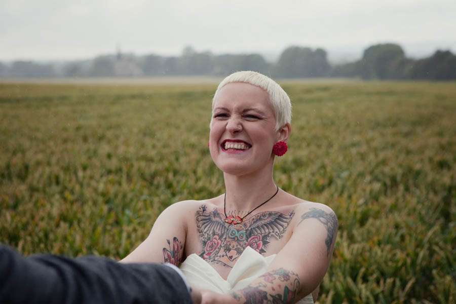 And finally, although you wouldn’t be able to tell from these fab photos and their infectious smiles, it actually poured rain for most of their wedding day. However Jenny advises future brides not to stress about it – you can’t control the weather after all! “To anyone out there fretting about what the weather will do on your day: for a year we planned an outdoor wedding, in what has turned out to be the wettest summer since 1912,” she concluded. “When it came down to it it rained (almost) continually. But… nobody cared! In some ways it even added to the atmosphere of it, everyone got stuck in, put up an umbrella and had a brilliant time! They still played our games and sat on our outdoor sofas and stayed