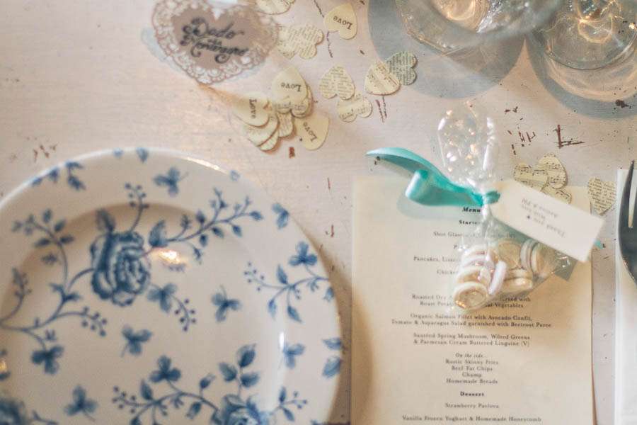 “We didn’t decorate anything in the restaurant except for some table confetti and the placecards. Everything was kept as simple as possible. I printed my own Order of Service and Menus, and hand-wrote the placecards but that was about it. We bought the table confetti and placecards from notonthehighstreet.com – a great website for anyone looking for some very pretty and quirky decorations! The Save the Date cards and Invitations were a simple postcard design and our cake was inspired by a photo we saw in our photographer’s sample wedding album. I can’t eat egg so a cheese cake it was!”