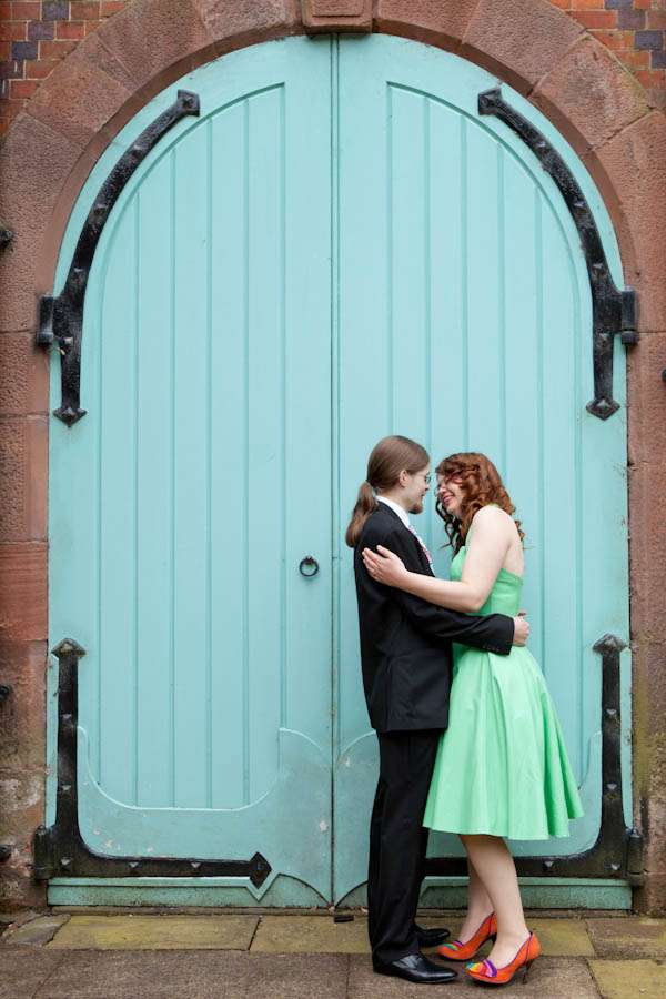“Finding a green dress was hard work though. At first I tried on bridesmaid dresses but I never really felt myself or special enough. I was also being pushed into trying on white dresses by everyone but I didn’t recognise myself. I’m a total tomboy at heart and the concept of being feminine for the day felt alien to me. I still don’t understand the concept of feeling like a princess on your wedding day. The most important thing was to feel like me. I found Vivien of Holloway online after looking at the adverts on Rock n Roll Bride. After three trips trying on various Vivien of Holloway dresses, I ended up ordering from a limited run of only 4 (!) plain green circle dresses. I love the fact that I can and will be able to wear my dress again and that I’m only one of 4 people to have bought it!”