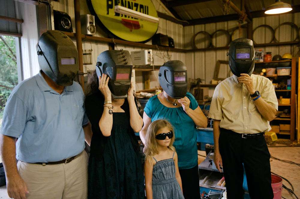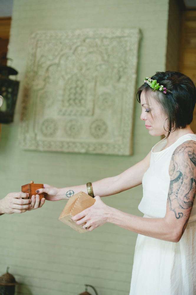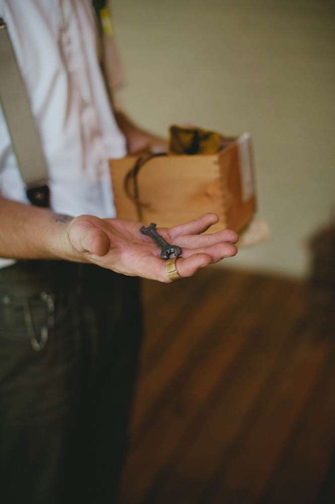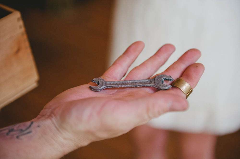 To showcase their love and their love of metal work (!) instead of a wedding cake the couple made a cake of steel which they ‘cut’ after the ceremony. “The cake was the best DIY thing I’ve ever been a part of”, explained the bride. “As I talked to April, our photographer, about my ideas for our wedding and about what would mean the most to me on the day, I got to thinking about the whole metal work thing and thought ‘holy crap instead of cutting a cake we will just light up the torch or plasma and cut steel instead and pose as if we were cutting the cake!!!’ When I shared my idea with James he said ‘well why not just make up a steel cake to cut????’ My jaw literally dropped at the sheer genius of the idea. At that moment I was utterly amazed and reminded again of why I am so helplessly attracted to this dude.”