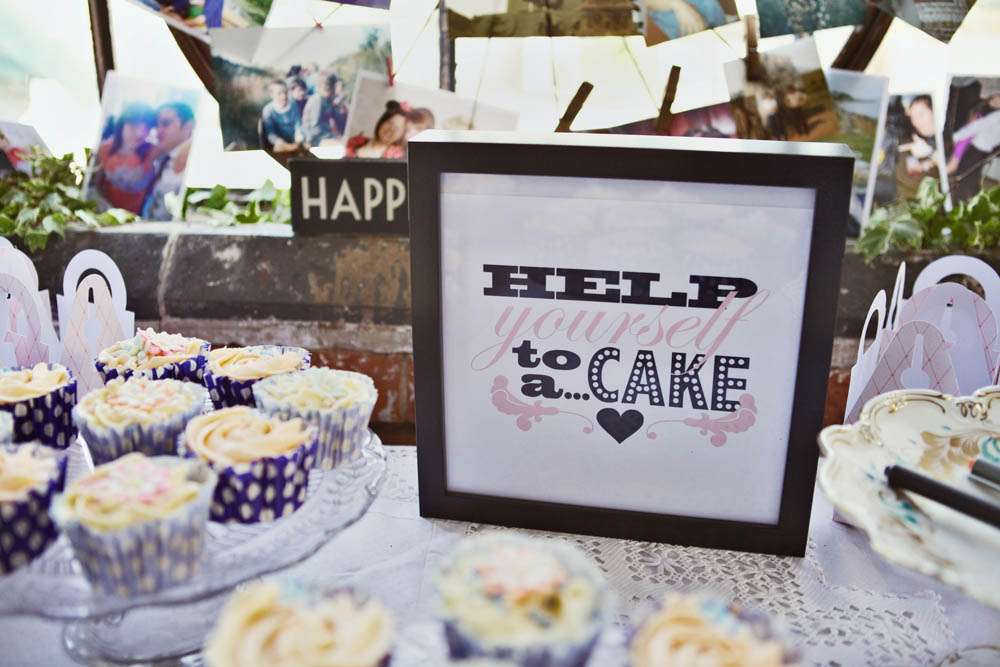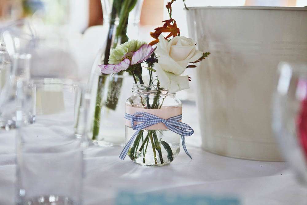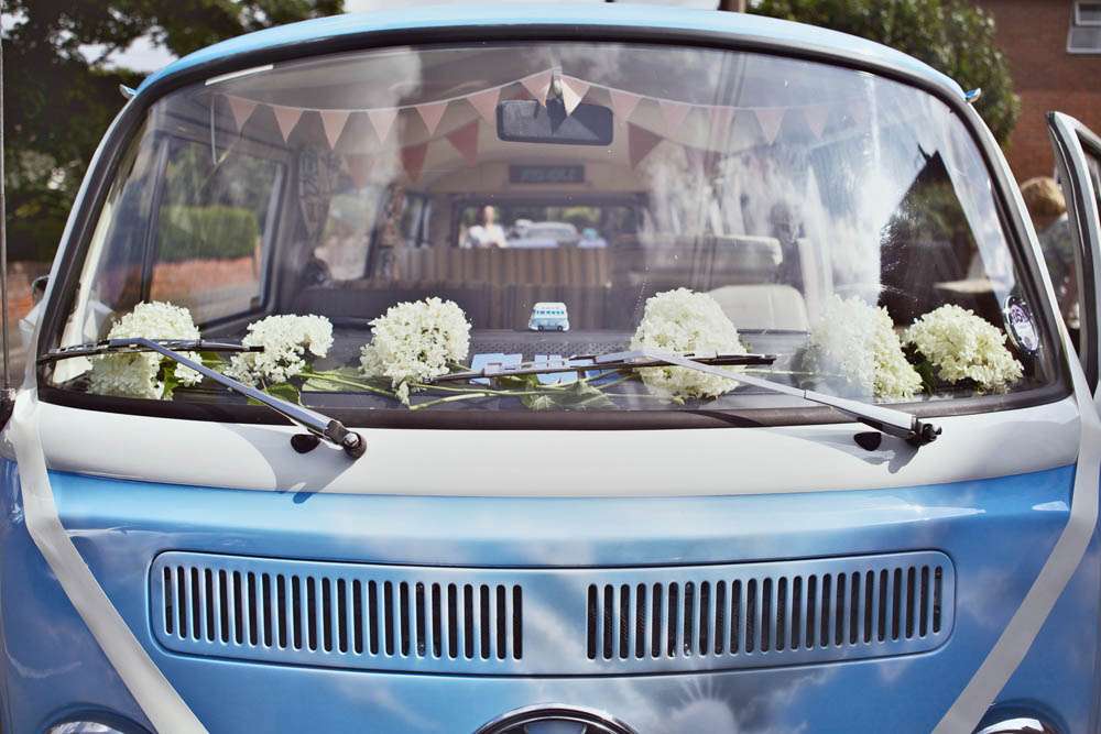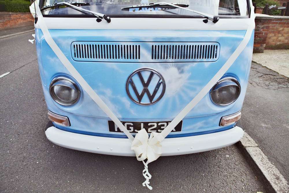 “My friend’s Mum made the gorgeous blue and orange bunting, the Headteacher at the school where I work iced the cake for us. My sister and I made fabric covered mirrors using her badge making machine as favours for the girls which went down really well (the boys had chilli chocolate). I also helped my DJ bridesmaid Vicky bake and decorate the cupcakes (you’ve got to have cupcakes!) Ooh and I made bows for the campervan! We even borrowed a cast iron postbox from a neighbour who has a postbox museum.”