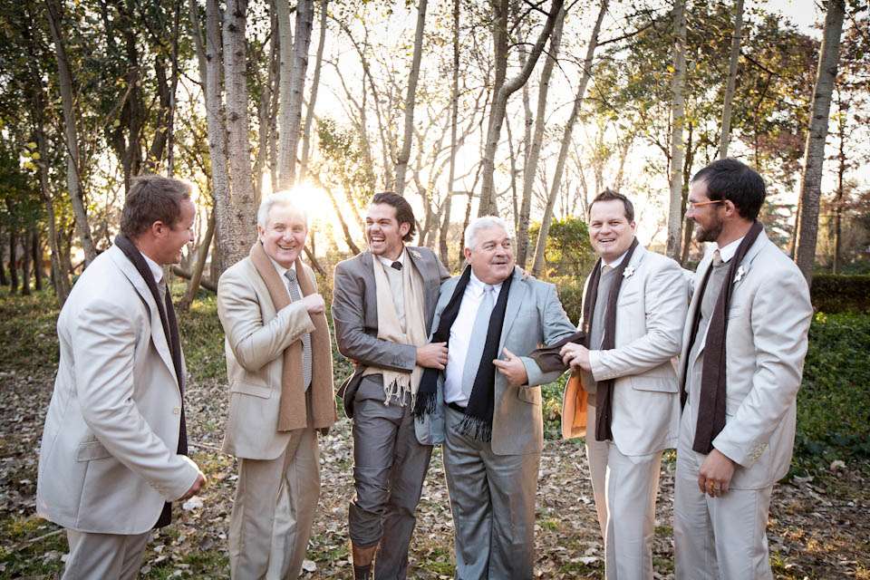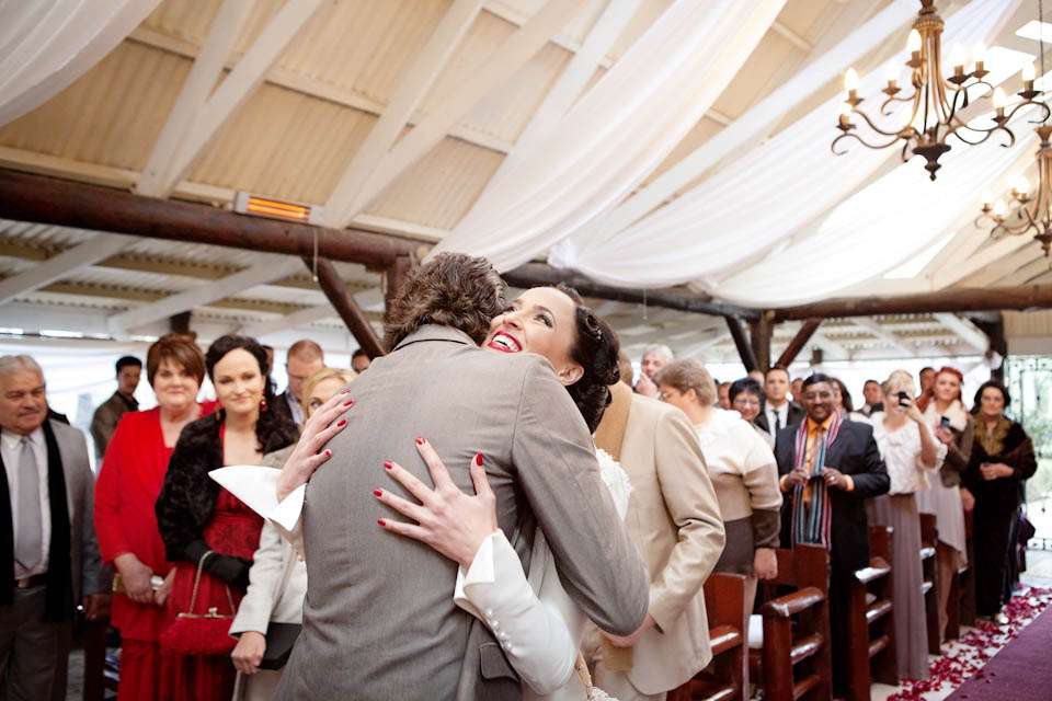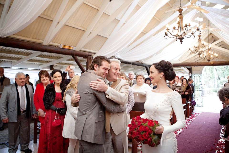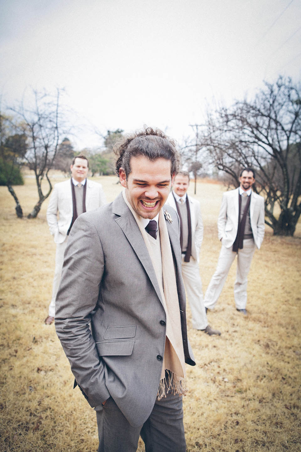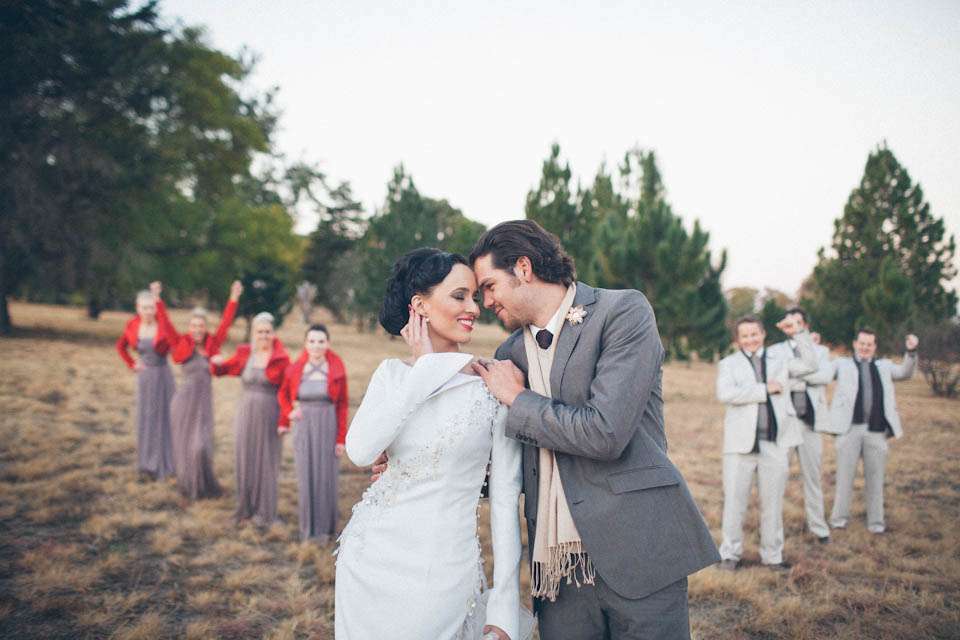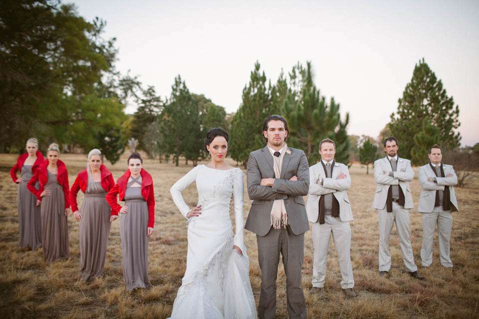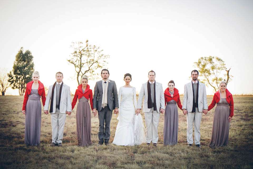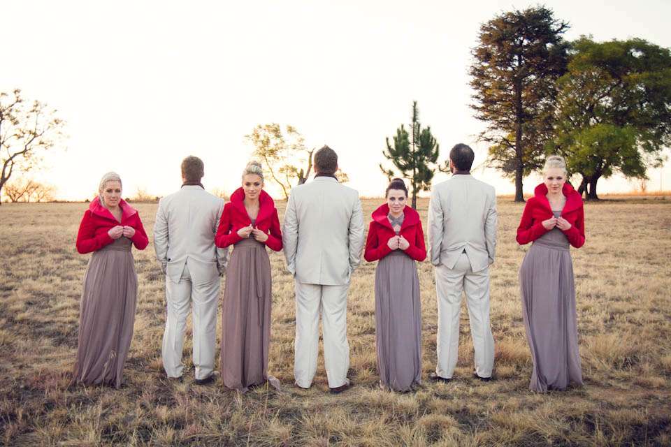 The wedding took place at Oakfield Farm in South Africa. The ceremony was held in the onsite chapel, and the reception in the homestead. For the decor, the couple went for a dramatic look with deep reds and earthy tones. “I’m not fond of the idea of ‘colour schemes’, but I love textures so we went for the earthy feel with just a little dash red”, explained the bride.” We added deep red roses and the bridesmaids wore red jackets. The rest we left up to mother nature!”