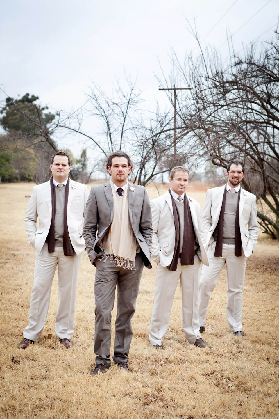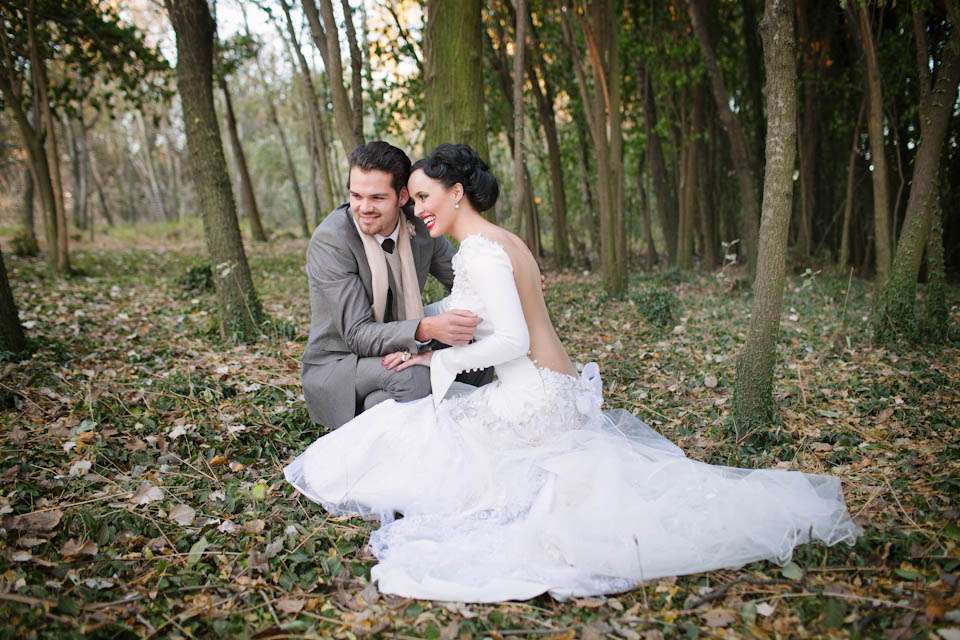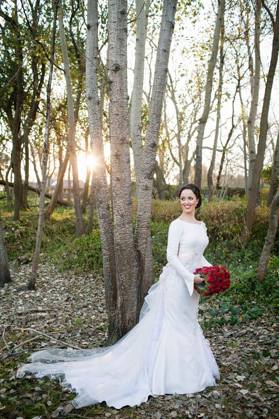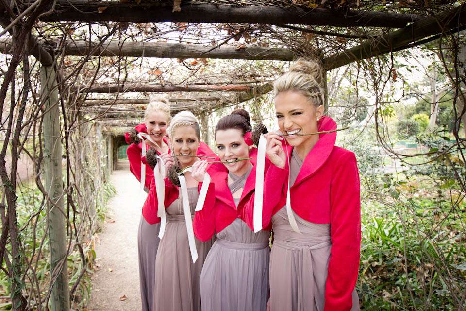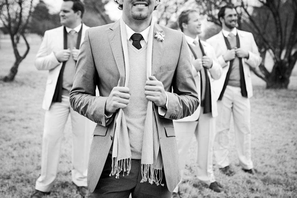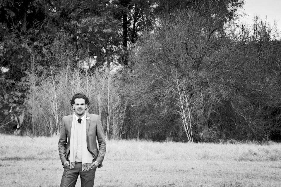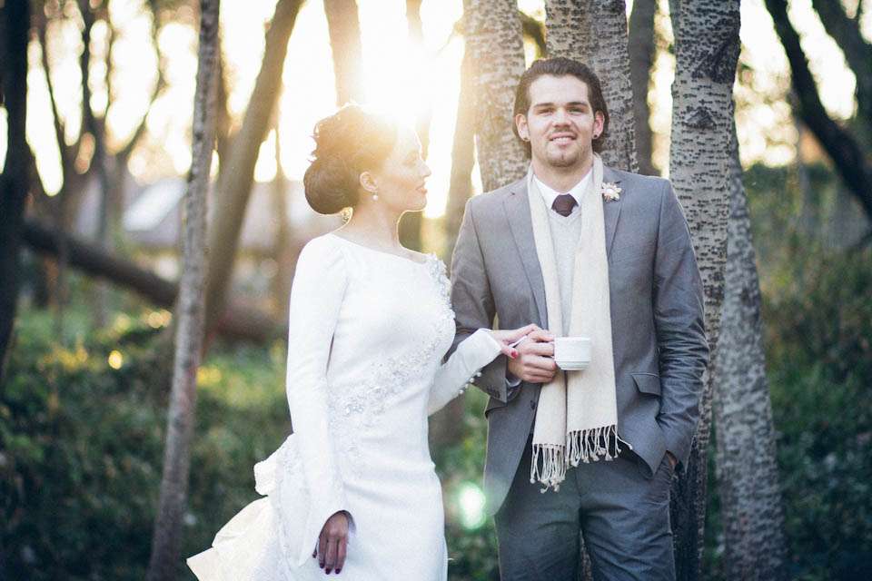 The wedding took place at Oakfield Farm in South Africa. The ceremony was held in the onsite chapel, and the reception in the homestead. For the decor, the couple went for a dramatic look with deep reds and earthy tones. “I’m not fond of the idea of ‘colour schemes’, but I love textures so we went for the earthy feel with just a little dash red”, explained the bride.” We added deep red roses and the bridesmaids wore red jackets. The rest we left up to mother nature!”