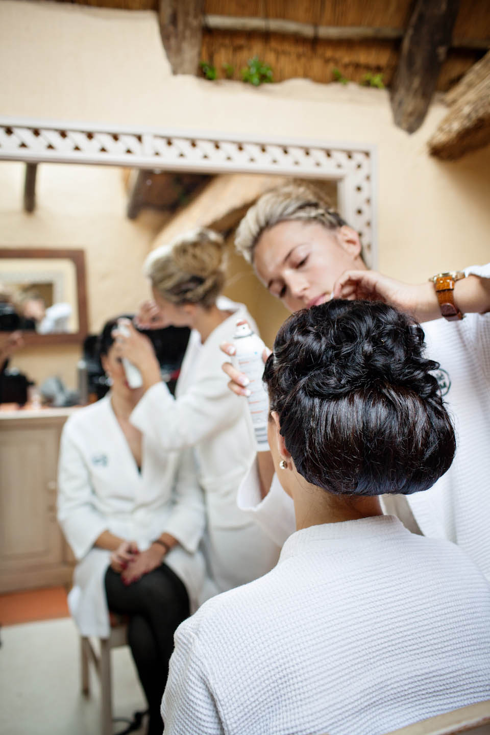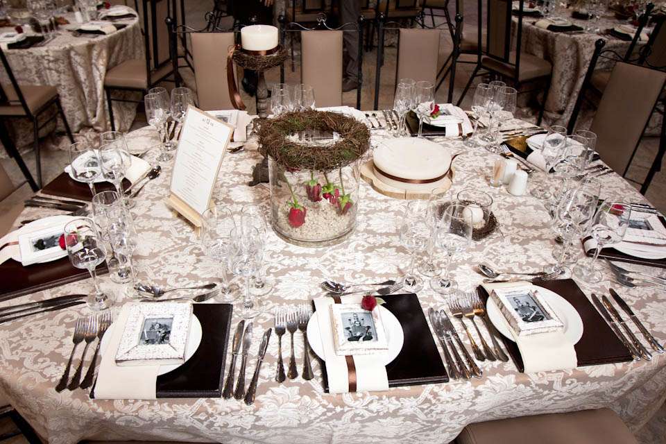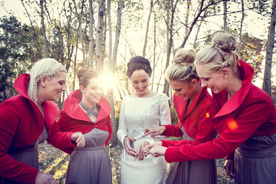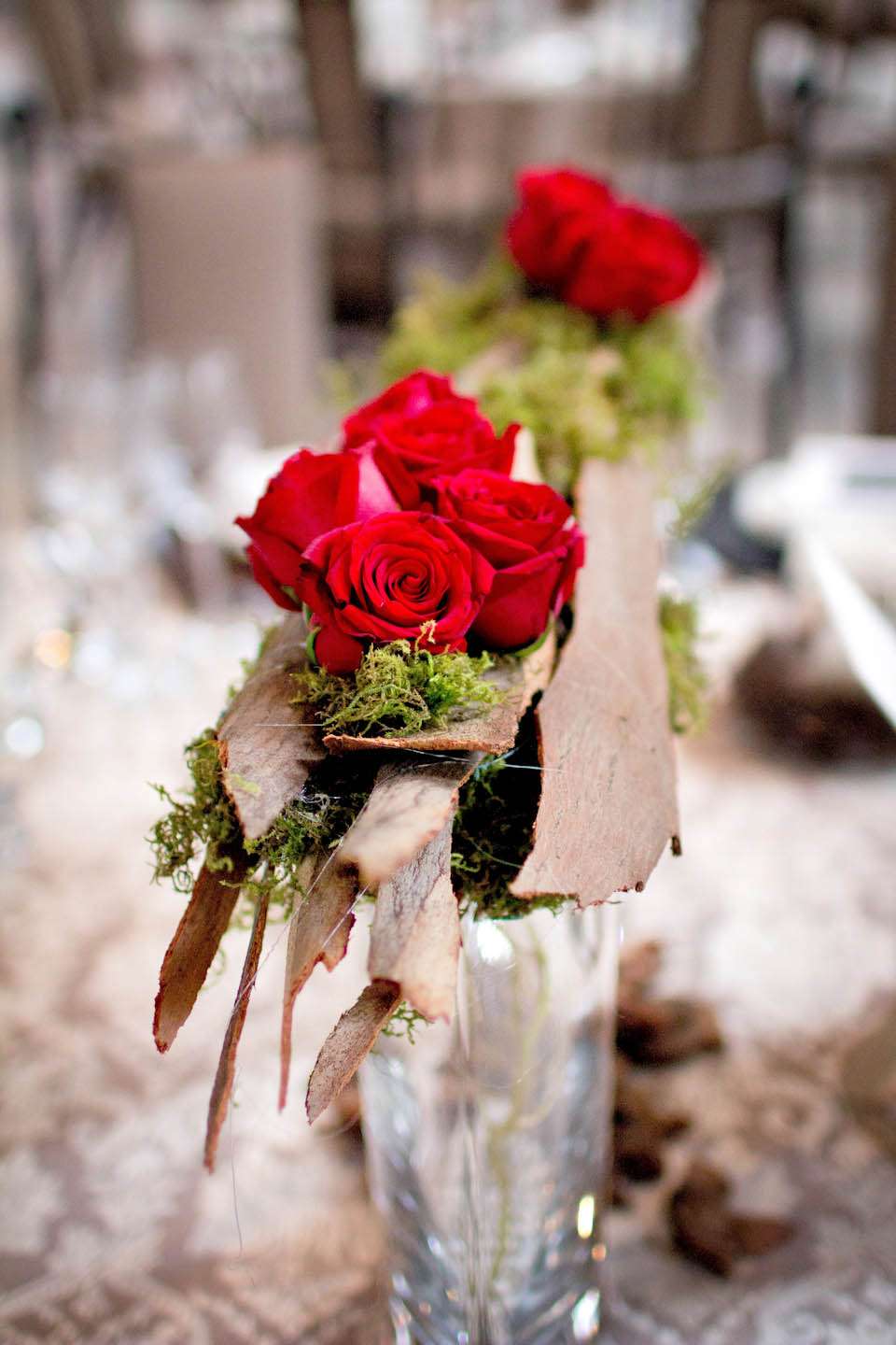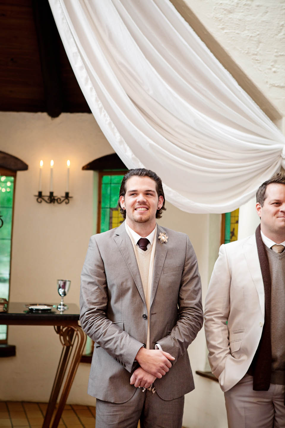 The wedding took place at Oakfield Farm in South Africa. The ceremony was held in the onsite chapel, and the reception in the homestead. For the decor, the couple went for a dramatic look with deep reds and earthy tones. “I’m not fond of the idea of ‘colour schemes’, but I love textures so we went for the earthy feel with just a little dash red”, explained the bride.” We added deep red roses and the bridesmaids wore red jackets. The rest we left up to mother nature!”