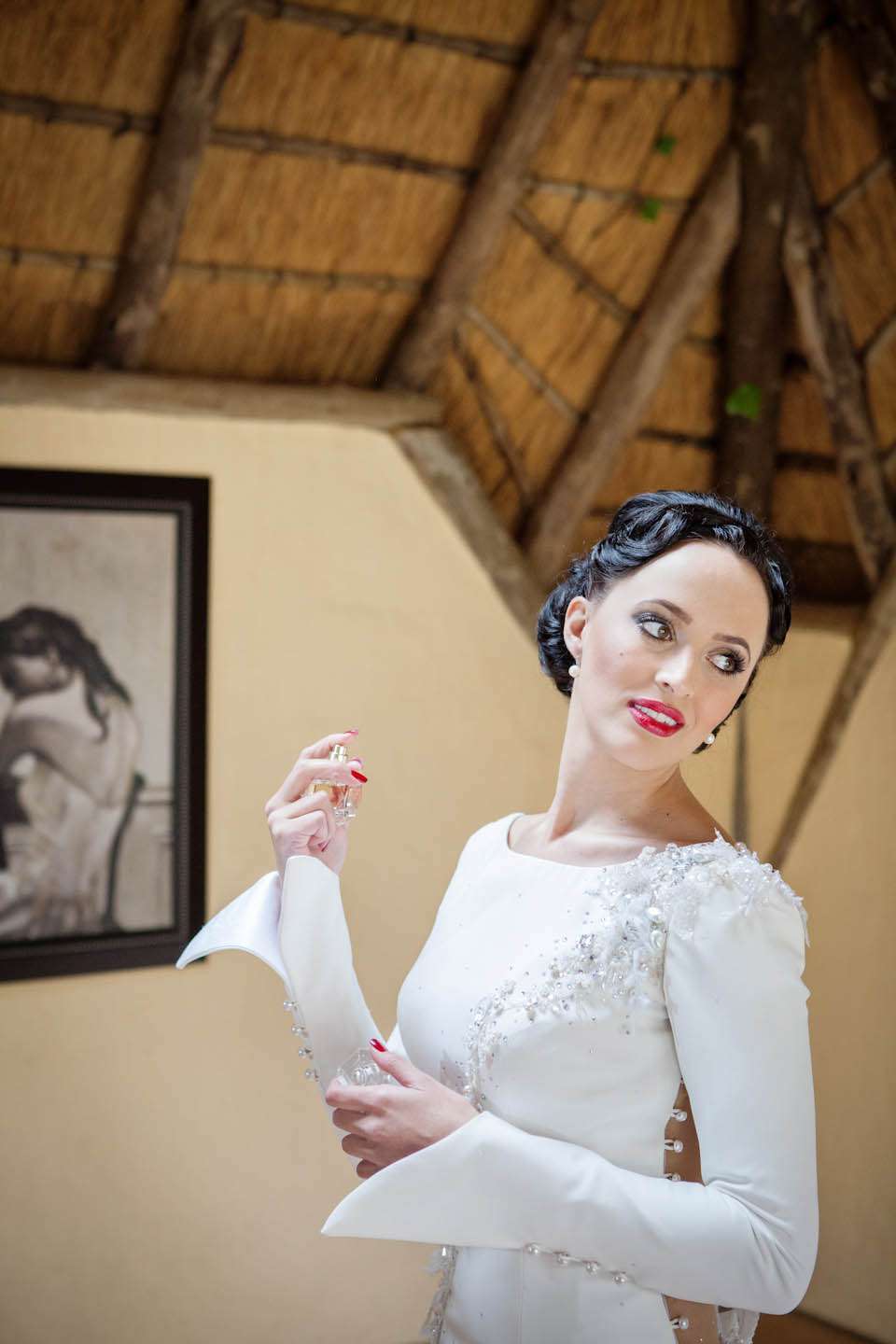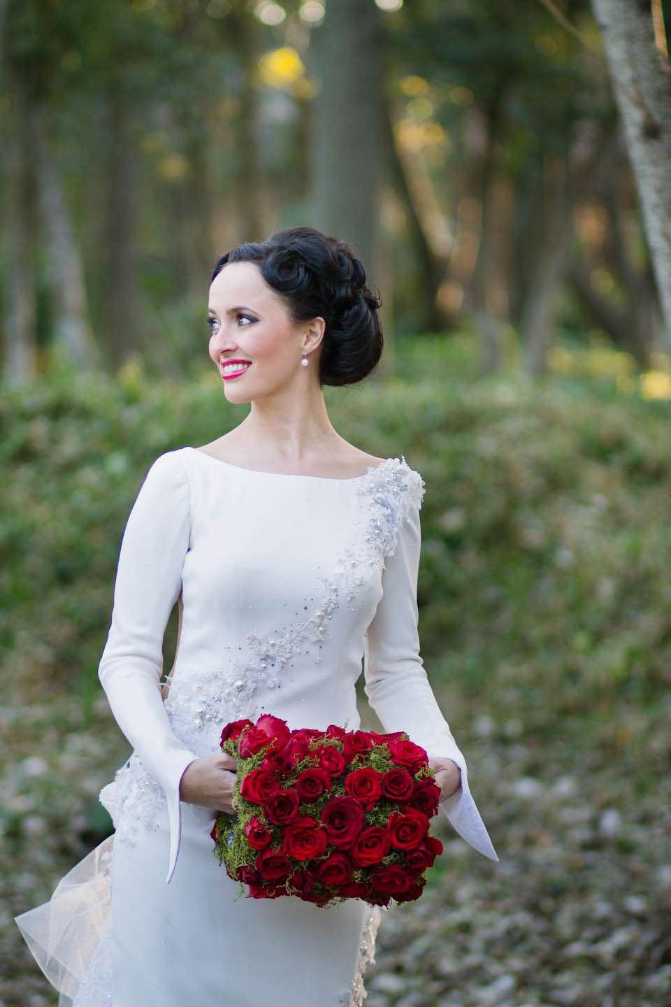 “I’ve always known I wanted a long-sleeved wedding dress, so when the time came I knew what I wanted, but the only problem was there wasn’t a single long-sleeved dress in any bridal shop. So instead I made my own. I had the basic design idea down and then went to see Peter Bondisio who made it all come to life! And what a masterpiece it was! My taste has always been somewhat unique and sometimes a little way out and my wedding wasn’t going to be any different. I decided to go for some dramatic red lips and nails. I chose this because I felt nothing embodies a real woman quite as much as red nails and fiery lips, and a wedding day is the day that allows a woman to be just that; 100% pure woman!”