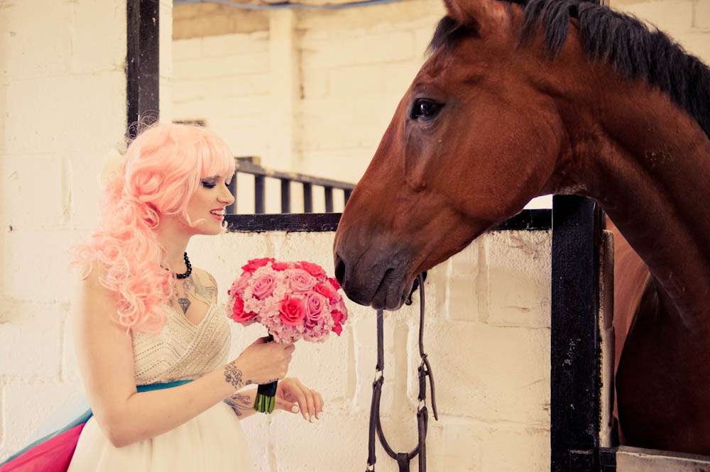 “As for me, I supplied the flowers. They needed to be bold but beautiful, and we were inspired by the colours of our model Ella’s exquisite tattoos. In fact, it was her Pegasus tattoos which gave me the idea to look for a stables venue. Squirrells Riding School were fantastically accommodating. Another of Ella’s tattoos led me to seek out some unique cupcakes. Delicieux came up trumps with not just the cupcakes but a full-size epic wedding cake too. Martin Hobby did his usual awesome job of the photography and I roped my daughter into the bridesmaid role.”